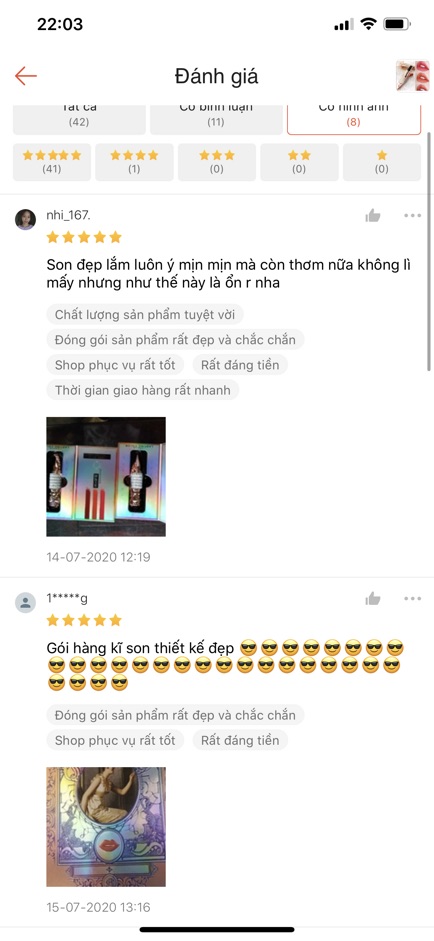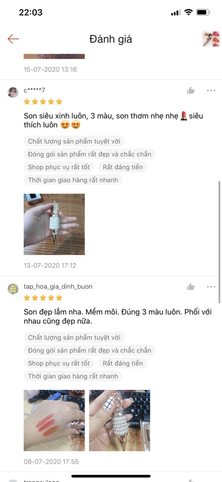 Sản phẩm Son Ba Màu Kim Cương Agag nhận được 14 lượt đánh giá tích cực từ những người mua khác. Bấm vào nút Xem Đánh Giá để chuyển sang phần đánh giá của người dùng đã mua hàng.