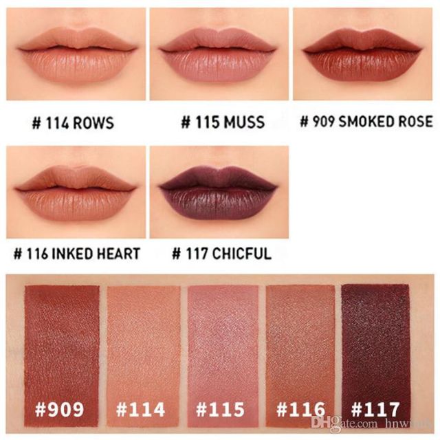 Son lì Mood Recipe Matte Xuất xứ: Hàn Quốc ✔️ Cực kì bền màu và lâu trôi ✔️ Chất son mềm mịn không làm khô hay lộ rãnh môi ✔️ Thiết kế lạ mắt gợi sự trẻ trung, năng động Bảng màu và chất #909: màu đỏ gạch, không quá nổi bật nhưng cũng đủ làm cho bạn trở nên quyến rũ, thu hút hơn. Đặc biệt, tông màu này không hề kém tông da mà còn tôn da sáng hơn, thích hợp cho người da ngăm.