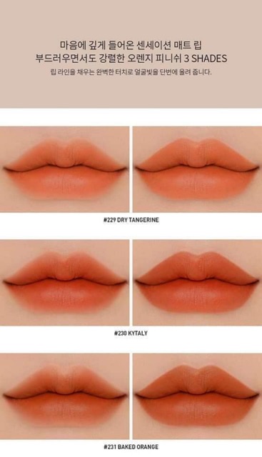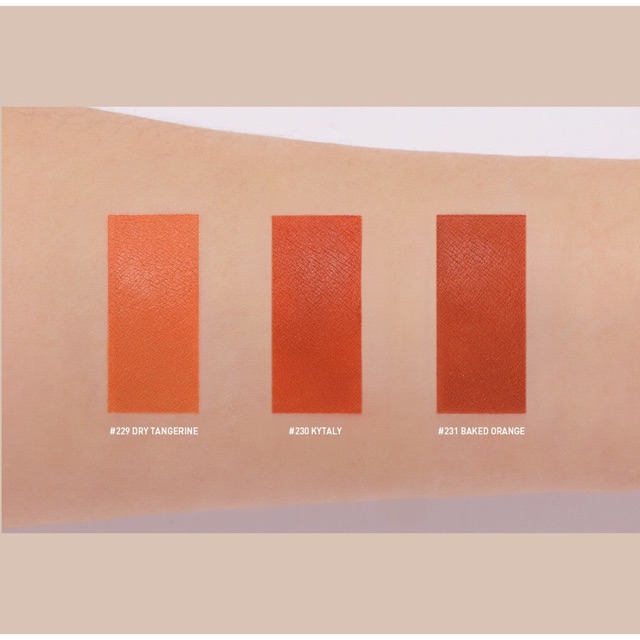 Bộ 3 màu son: #229 #230 #231 lấy cảm hứng màu sắc từ màu cam trầm, đây là dòng chất liệu basic nổi tiếng của 3ce với chất liệu lì mềm mướt, chinh phục bất kỳ sự khó tính nào của khách hàng. 3CE Lip Color Matte sở hữu chất son lì, có khả năng bám dính lên màu và khả năng lên màu cực chuẩn nhé, không hề bị bột, cực kì mịn, mềm mượt và mỏng nhẹ lên môi. – Màu #229 – Dry Tangerine – màu vỏ quýt khô – pha đất ít nên em này tươi trẻ và năng động nhất đây – Màu #230 – Kytaly – tông đỏ gạch pha hồng xíu xiu, lên môi son nghiêng về tông ấm xinh cực kì luôn ạ – Màu #231 – Baked Orange – cam cháy pha nâu, tông son xịn mịn, sang chảnh