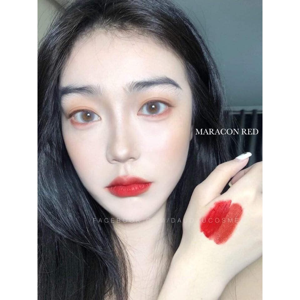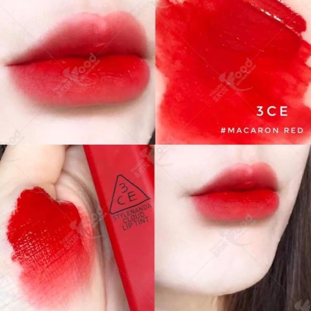 Những ngày gần đây, các tín đồ của 3CE có lẽ đang đắm chìm trong bộ sưu tập mới – 3CE Cloud Lip Tint. Nếu như bạn hỏi về màu son “quốc dân” thì câu trả lời chính là sắc đỏ hồng của em son 3CE Cloud Lip Tint Macaron Red trong chính bộ sưu tập này. Cùng Kyo.vn khám phá xem Macaron Red có gì nổi bật nhé! Em son 3CE Cloud Lip Tint Macaron Red xuất hiện trong bộ sưu tập lần này chinh phục hầu hết các chị em xứ sở Kim Chi với màu son đỏ hồng vô cùng thu hút. Sắc đỏ rực rỡ và quyền lực kết hợp với sắc hồng dễ thương tạo nên một màu son hút mắt vô cùng. Vừa có chút bánh bèo, lại vừa quyến rũ đến nao lòng. Màu son đỏ hồng không chỉ giúp răng của chị em trông trắng hơn mà còn tôn da, tone da nào dùng cũng đẹp và có thể xài vô tư cả khi để mặt mộc. Gương mặt bừng sáng ngay khi thoa son 3CE Cloud Lip Tint Macaron Red lên môi. Đặc trưng của dòng son 3CE Cloud Lip Tint nói chung và em son 3CE Cloud Lip Tint Macaron Red này nói riêng đó là chất son mềm tự làn mây. Chính sự mướt, nhẹ, lì mà vẫn có độ ẩm giúp mềm môi, phủ đều trên môi chỉ sau 1 lần quẹt. Thỏi son kem lì này có chất xốp cho cảm giác mát ẩm khi vừa đánh son. Thoa lên thấy rất đều màu, dễ tán, nhẹ môi và dễ chịu. Chất son lên màu khá tốt, bởi vậy những bạn có nền môi tối màu cũng không lo khi dùng em son này. Đồng thời, chị em mô khô cũng không lo lắng vì son 3CE Cloud Lip Tint Macaron Red sẽ không để môi mình bị khô hay để lộ vân môi xấu xí đâu nhé!