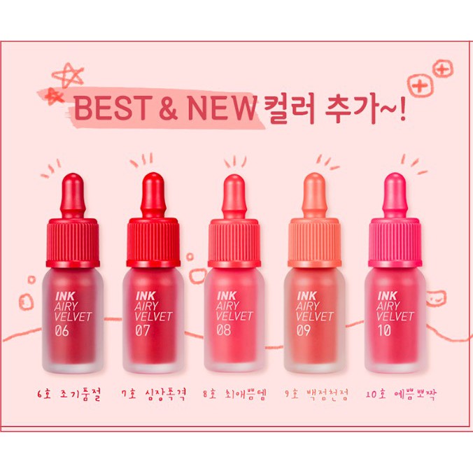 Cả dòng velvet nước truyền thống thêm màu mới Bảng màu nhìn hơi bị xinh. Tại chưa có review nên k dịch cho chị em được. Nhưng chất son peripera trước giờ được khen nhiều về độ lì bám lâu và lên màu nè. Sẵn các màu: #01 đỏ hồng trầm #02 cam đất #03 cam san hô #04 hồng đào #05 hồng tím trầm #06 đỏ thuần #07 đỏ cam #08 hồng cam #09 cam san hô #10 hồng cam đào
