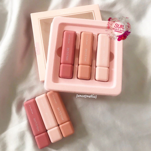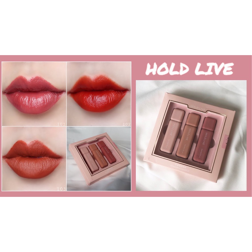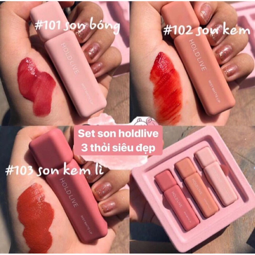 [NEW] SET SON HOLD LIVE MIST MATTE LIP- Hãy là người đầu tiên cầm trên tay set son kem Hold live siêu hot mới nhất này nè các cô gái ơi!!! Set gồm 3 cây son summervibes : 1. Son Tint bóng màu Bean paste ( hồng đậu đỏ nâu) 2. Son velvet đỏ cam Long Island 3. Son lì đỏ gạch Caramel Phiên bản mới : Mẫu mã đẹp mắt thiết kế sang trọng - Chất son được review điên đảo, siêu mềm, siêu lì, màu hot trend đẹp cực Chất son lì, mướt môi, giữ cho môi luôn mượt và ăn khó trôi lắm nhé. Lên màu cực đẹp, cả môi thâm cũng dễ lên màu ạ Phải công nhận là Hold Live cập nhật mẫu mã và chất lượng nhanh chóng lắm luôn ấy. Set sau ngày càng cute hơn set trước. SET MIST MATTE LIP này là set mới nhất của hãng luôn ấy.