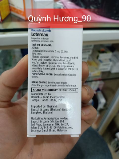 ➡️Quỳnh Hương shop cam kết hàng chuẩn giá cả hợp lý Quỳnh Hương shop cam kết hàng chuẩn giá cả hợp lí Thành phần: Loteprednol etabonate 0.5% Chỉ định: Các tình trạng viêm có đáp ứng với steroid Đóng gói: Lọ 5ml Nhà sản xuất: Bausch & Lomb,Thái Lan.