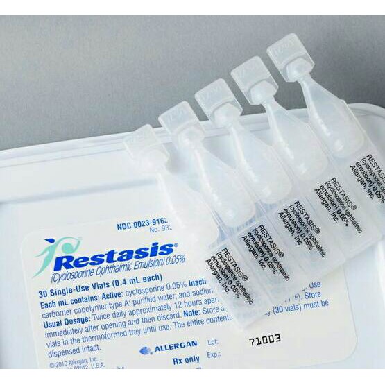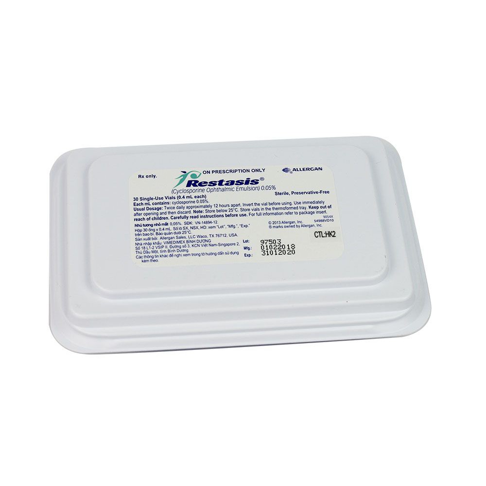 Dạng bào chế : Nhũ tương nhỏ mắt Đóng gói: Hộp 30 ống x 0,4ml Bán lẻ : 150.000đ/5 ống Xuất xứ: Mỹ Liều lượng và cách dùng: Xoáy ngược ống thuốc đơn liều vài lần để tạo được nhũ tương trắng đục đồng nhất trước khi sử dụng. Nhỏ một giọt RESTASIS™ vào mỗi mắt, 2 lần mỗi ngày, cách khoảng 12 giờ. Viêm khô kết – giác mạc (hội chứng khô mắt) là một bệnh mãn tính. Bệnh nhân cần được tư vấn không nên ngừng điều trị sớm. RESTASIS™ có thể được sử dụng đồng thời với nước mắt nhân tạo với khoảng cách 15 phút giữa 2 thuốc. Nên xoay ngược ống thuốc vài lần để tạo được nhũ tương trắng đục đồng nhất trước khi sử dụng. Vứt bỏ ống thuốcngay sau khi dùng. Chống chỉ định: RESTASIS™ chống chỉ định ở những bệnh nhân bị nhiễm trùng mắt tiến triển và những bệnh nhân đã có hay nghi ngờ quá mẫn cảm với cyclosporine hoặc bất kỳ thành phần nào của thuốc. G. Cảnh báo: Để tránh nhiễm bẩn hoặc khả năng gây tổn thương mắt, không để đầu ống thuốc chạm vào bất kỳ bề mặt nào và tránh tiếp xúc với mắt. RESTASIS™ chưa được nghiên cứu đầy đủ ở những bệnh nhân có tiền sử viêm giác mạc do herpes tái phát. Thận trọng: Đọc kỹ hướng dẫn sử dụng trước khi dùng. Nếu cần thêm thông tin, xin hỏi ý kiến bác sỹ. Thuốc này chỉ dùng theo đơn của bác sỹ. Chỉ dùng nhỏ mắt. #Restasis