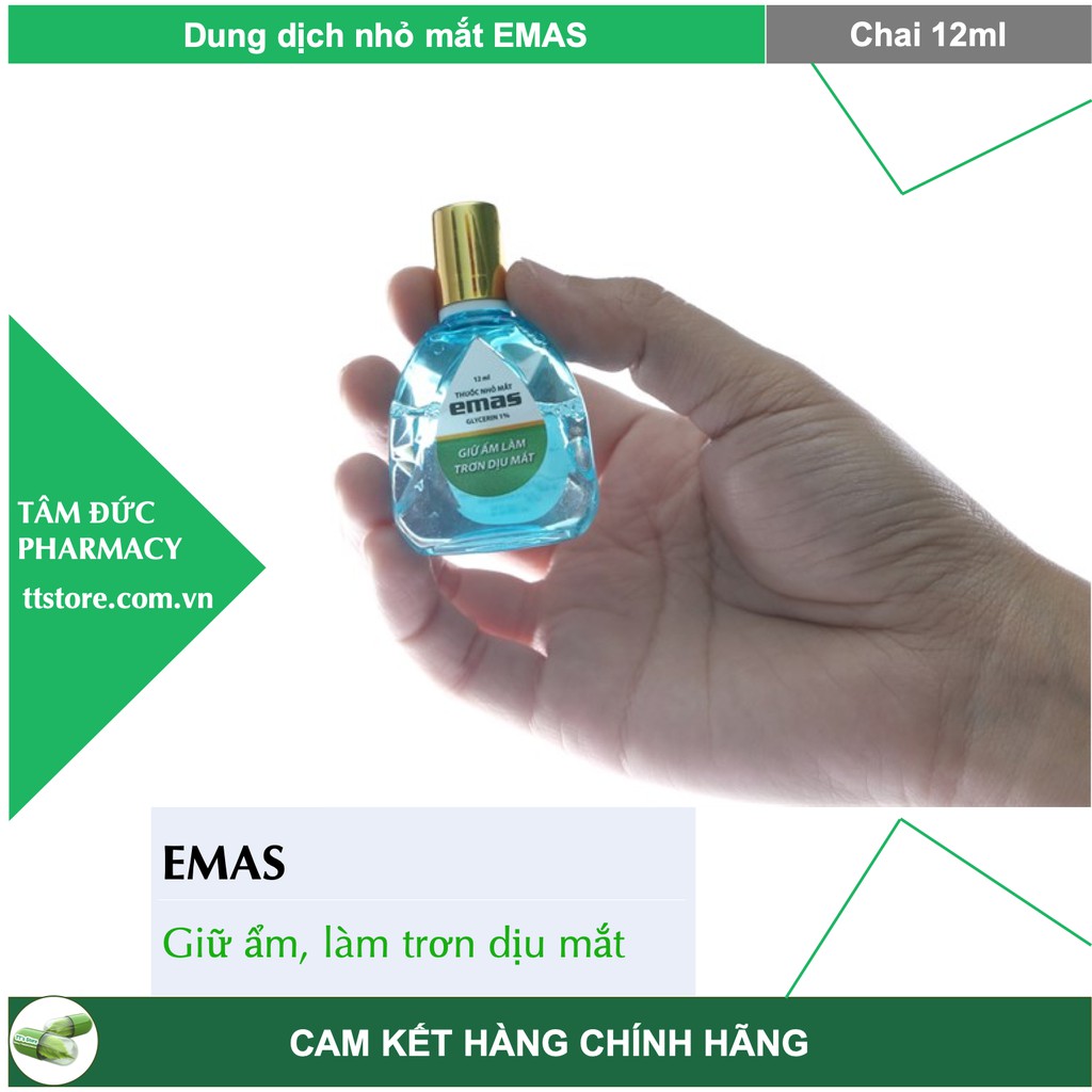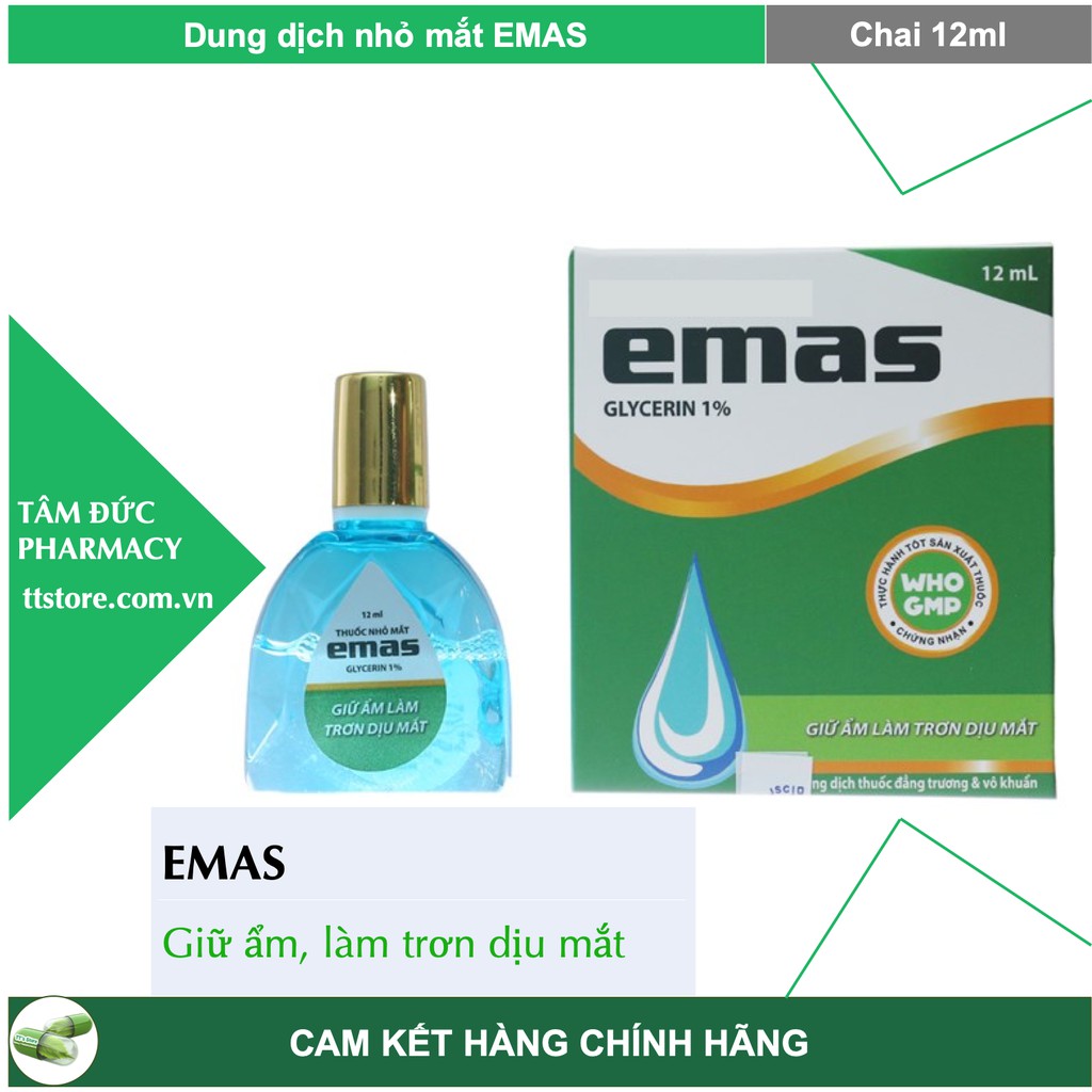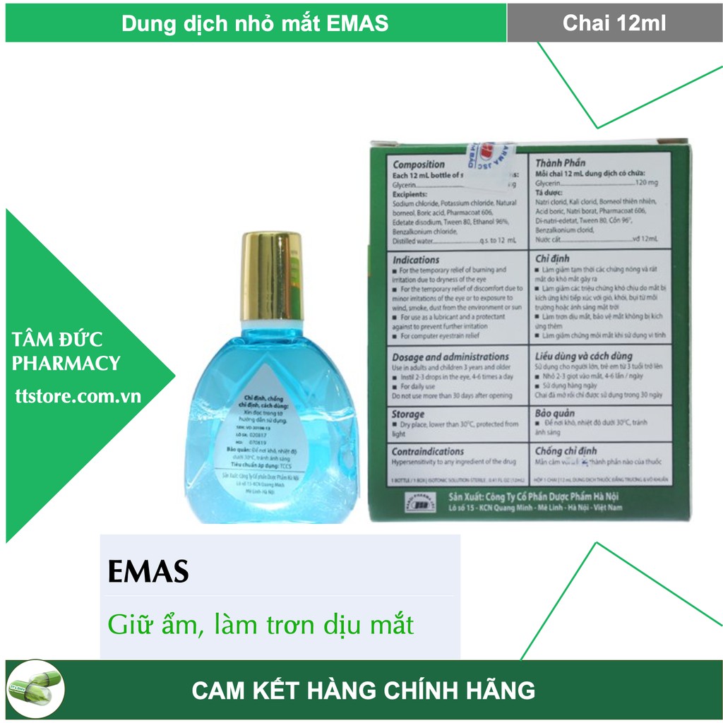 Dung dịch dưỡng ẩm mắt EMAS **Thông tin sản phẩm: THÀNH PHẦN: Glycerin ........................... 1% Tá dược vừa đủ. CÔNG DỤNG: Làm giảm tạm thời các chứng nóng mắt, rát mắt do khô mắt gây ra, giảm các triệu chứng khó chịu do mắt bị kích ứng khi tiếp xúc với gió, khói, bụi từ môi trường hoặc ánh sáng mặt trời. Trơn dịu mắt, bảo vệ mắt không bị kích ứng thêm. Giảm chứng mỏi mắt khi sử dụng máy vi tính. CÁCH DÙNG: Sử dụng cho người lớn và trẻ em từ 3 tuổi trở lên. Nhỏ 2 - 3 giọt vào mắt, 4 - 6 lần/ngày. Sử dụng hàng ngày. Nhà sản xuất: Dược Phẩm Hà Nội Xuất xứ: Việt Nam #emas #nhỏ_mắt #giữ_ẩm_mắt #làm_trơn_mắt