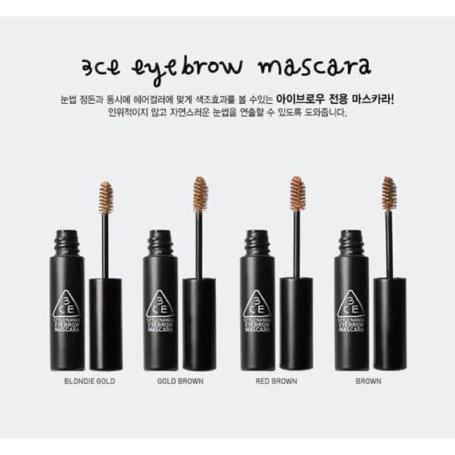 ❗❗#hàng_về #SALE70% Mascara cho lông mày của nhà 3CE 🍂🍂 3 CONCEPT EYES EYEBROW MASCARA 🔸Mascara dành riêng cho lông mày với màu sắc tự nhiên và giúp lông mày vào nếp suốt cả ngày. Giúp đôi chân mày nhìn tự nhiên, gọn gàng vào nếp hơn. 🔸Giải quyết được vấn đề màu lông mày tự nhiên khác biệt với màu tóc nhuộm 🔸Khắc phục được tình trạng lông mày của bạn quá thưa và mỏng 🔸Giúp màu lông mày đều màu, không bị quá nhạt màu dưới ánh mặt trời 🔸Có 4 tone màu thoải mái lựa chọn phù hợp với màu tóc: #BLONDIE_GOLD: Tone màu vàng sáng- hợp với các màu tóc tẩy, bạch kim. #GOLD_BROWN : Tone màu vàng nâu – hợp với màu tóc nâu sáng. #RED_BROWN: Tone màu nâu đỏ – Hợp với các màu tóc nhuộm nâu đỏ, hoặc ánh tím #BROWN: Tone nâu - Hợp với các màu tóc đen, nâu chocolate và các màu nhuộm không quá sáng