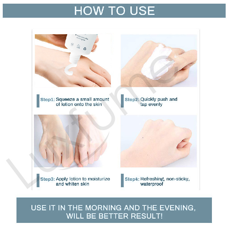 Quantity: one piece Content: 60ml. Ingredients: squalane, trehalose, mint, geranium extract, sophora flavescens extract Products, titanium dioxide, hyaluronic acid and other Characteristics: fine texture, easy to push, refreshing and non-greasy, brightening skin tone, even skin tone Description: concealer under the arm (or gravel or other parts that need even skin tone), antiperspirant body, moisturizing Soothing, it can well conceal small skin imperfections, even and brighten skin tone. The texture is fine, easy to push, refreshing and not greasy, instantly brightens the skin and evens the skin tone. Use: Step1: Squeeze a small amount of lotion onto the skin Step2: Quickly push and tap evenly Step3: Apply lotion to moisturize and whiten skin Step4: Refreshing, non-sticky. waterproof