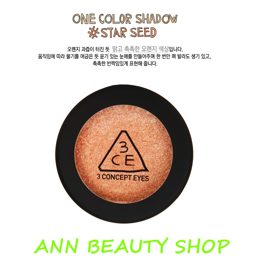 Hàng mua lúc sale 70% nên giá siêu tốt - 3CE One Color Shadow là sản phẩm phấn mắt của 3CE được thiết kế dưới dạng phấn nén, màu sắc nổi bật cùng với thành phần bột ngọc trai sẽ khiến đôi mắt của bạn trở nên long lanh hơn bao giờ hết. - Nếu chỉ kẻ mắt, chải mascara đôi mắt của bạn sẽ trở nên quyến rũ nhưng vẫn chưa thực sự nổi bật. Bạn cần thêm màu mắt với những màu sắc đa dạng, và có loai kèm kim tuyến, nhũ sẽ khiến bạn trở nên thật sự nổi bật và quyến rũ hơn bao giờ hết. Độ bền màu của 3CE One Color Shadow khá tốt, lâu phai và không thấm nước ► SALE CÁC MÃ 1/ #URANUS (CÓ NHŨ) 2/ #CINNAMON (LÌ KO NHŨ) 3/ #CHOCOLATA (LÌ KO NHŨ) 4/ #TOMARED (LÌ KO NHŨ- CÓ THỂ DÙNG LÀM MÁ HỒNG) 5/#STARSEED - Màu này siêu xinh + dễ dùng. Ngoài dùng cho mắt, có thể nhấn nhá thêm xíu cho vùng má cho tone xẹt tone cũng dc luôn ạ (nếu các bạn thích vùng má bắt sáng và có nhũ nhẹ)