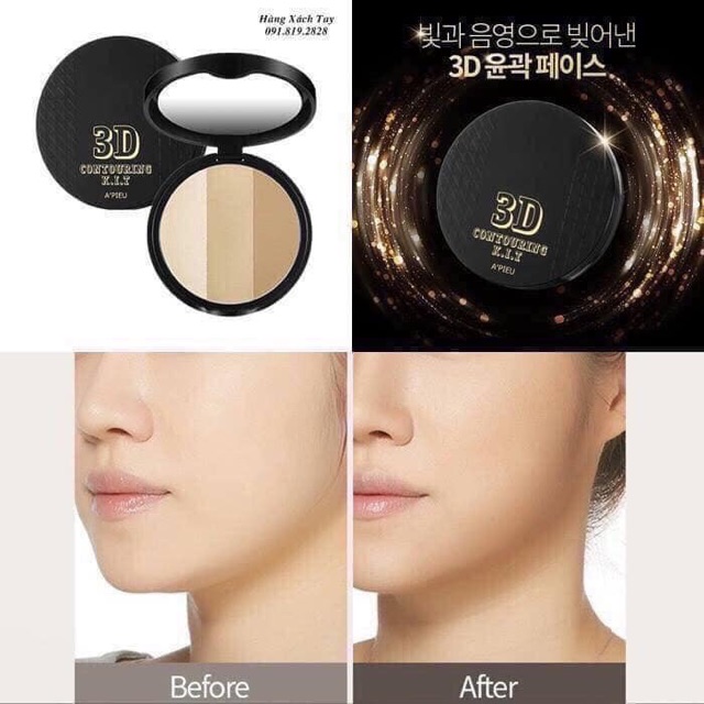 [HÀNG CÓ SẴN GIÁ SALE 50%] Phấn tạo khối 3 màu tiện dụng của Apieu *** GIÁ #195k/ HỘP *** Có tone #01: cho da sáng và #02: cho da trung bình A'pieu 3D Contouring Kit là tạo khối với thiết kế dạng bột dễ tán, tiện lợi và dễ dàng điều chỉnh độ đậm nhạt. +Set có 3 ngăn: Highlight - Shading 1 - Shading 2, trong đó 2 ngăn shading là 2 tone màu đậm nhạt khác nhau giúp sử dụng linh hoạt hơn theo từng vùng hoặc từng concept trang điểm, giúp lưu màu lâu bền hơn, blending và dễ chỉnh sửa hơn, thích hợp với cả các nàng mới tập đánh khối. -Phấn có dạng bột siêu mịn, có thể layer thành 2~3 lớp mà không lo bị mốc, dày phấn và tăng khả năng bám màu lâu hơn. -Chứa các thành phần thiên nhiên như chiết xuất hoa sen, các loại khoáng hỗ trợ dưỡng da. Ann