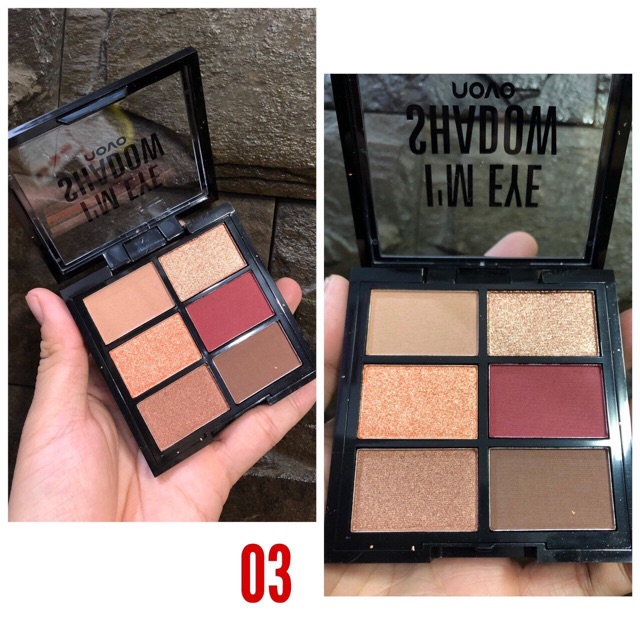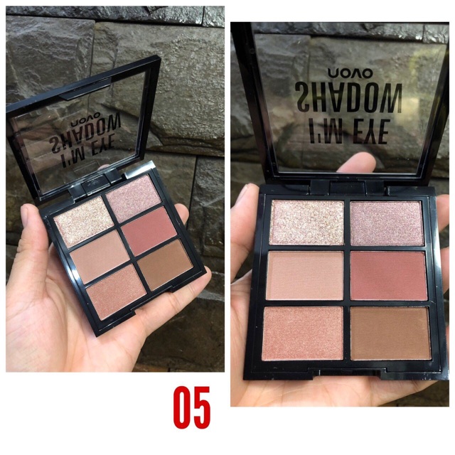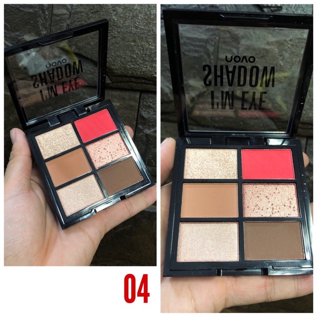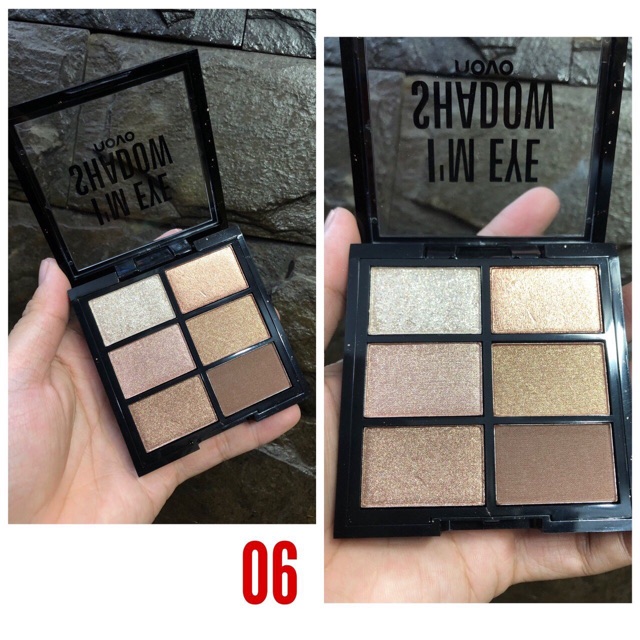 Bảng màu mắt NOVO với 6 ô màu. Hộp có 3 màu nhũ, 3 màu lì. Thiết kế bên ngoài là vỏ nhựa cứng bóng, cầm nhẹ tay nhưng không kém phần sang chảnh. Nhỏ gọn , tiện lợi dễ mang theo người. Chất phấn mịn, bám da và lên màu rất ổn, đúng với màu trong hình. Các bạn nên che khuyết điểm để phấn lên màu được chuẩn hơn nhé