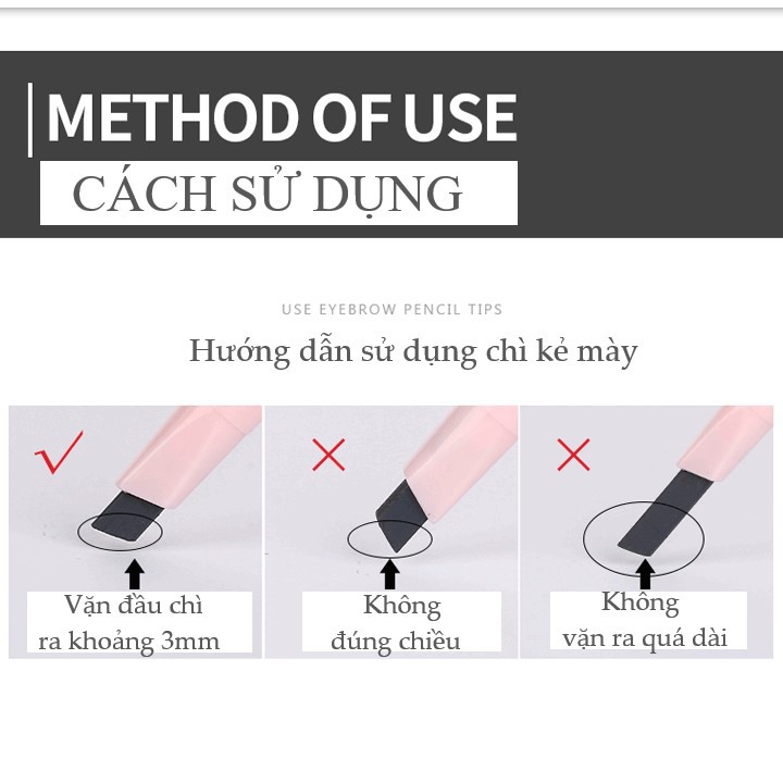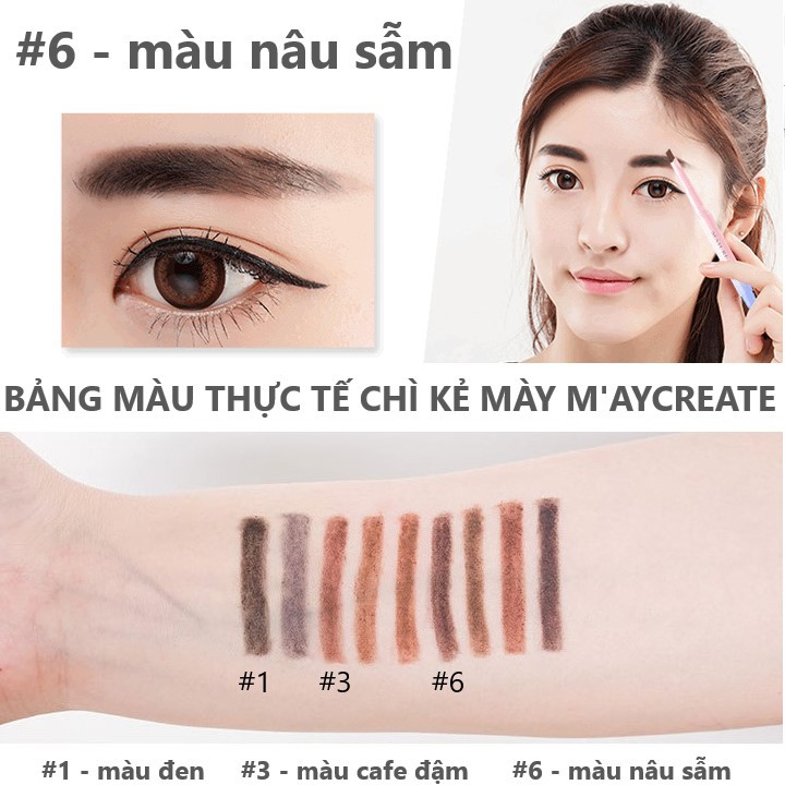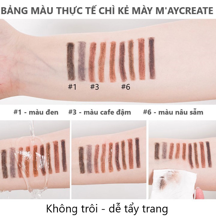 Chì kẻ mày 2 đầu MayCreate Eyebrow Pencil * Xuất xứ: nội địa Trung Quốc * Trọng lượng: 0.3g ❤❤❤ Về thông tin Chì kẻ mày , bút kẻ mày 2 đầu Maycreate CHÍNH HÃNG 2 màu mới nhất - Màu đen - Màu nâu Maycreate Eyebrow Pencil là bút kẻ lông mày với thiết kế 2 đầu tiện dụng: * 01 đầu là chì kẻ chân mày * 01 đầu là cọ chải lông mày - Siêu mịn, không thấm nước, không trôi, màu bền. - Màu sắc tự nhiên, tinh tế, đa dạng - Đầu kẻ dẹt tinh tế, mịn màng; không quá mềm cũng không quá cứng. Sử dụng đặt ngang hoặc hơi chéo để dễ dàng định hình cả khuôn mày. - Đầu chuốt giúp lông mày đậm, nét và cùng màu với cả khuôn mày - Nguyên liệu được chiết xuất từ các thành phần tự nhiên rất an toàn. - Chính hãng MAYCREATE 👉 Hướng dẫn sử dụng: Trước tiên vặn sản phẩm lên khoảng 3mm sau đó: Bước 1: Dùng đầu cọ kẻ lông mày, kẻ men theo đường từ đầu lông mày cho đến đỉnh mày khoảng 2/3 chân mày Bước 2: Từ đỉnh lông mày tiếp tục kẻ cho đến hết chân mày (1/3 còn lại) Bước 3: Dùng bút chì nâu kẻ dài lại từ đầu chân lông mày cho đến cuối chân mày. Bước 4: Dùng đầu chuốt lông mày chuốt từ từ đều theo chiều lông mày để tông màu kẻ được đều đặn và tự nhiên hơn. 👍 Cam kết chất lượng tốt, không gây dị ứng.