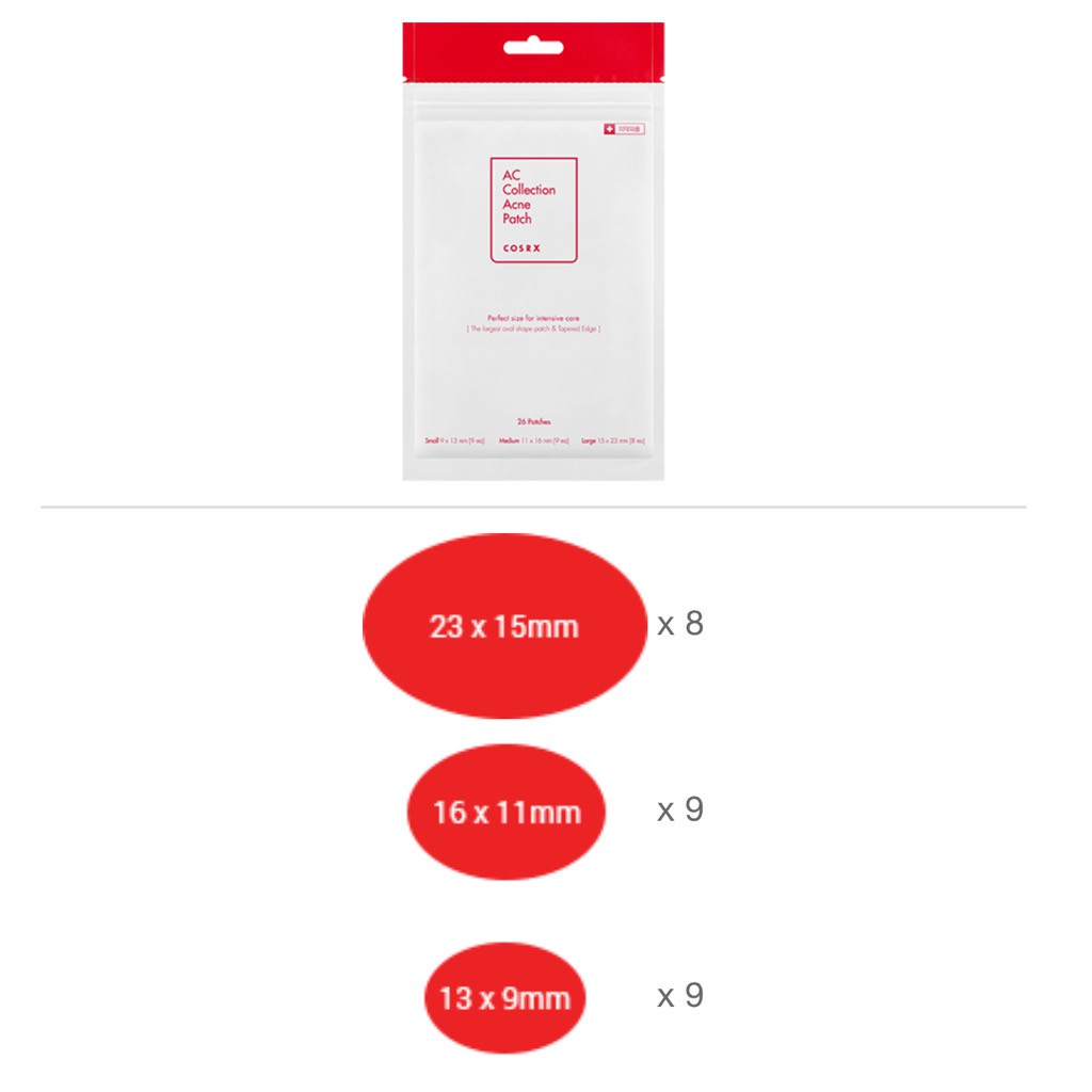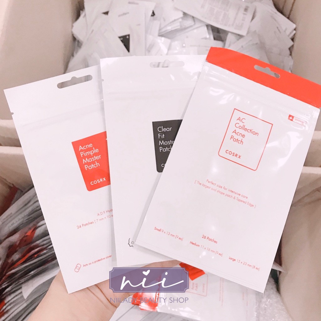 Dán mụn Cosrx hiện có 3 loại: ✔️CLEAR FIT : mỏng hơn, ít bị lộ hơn. Gồm 18 miếng tròn 1 kích thước: (18miếng 10mm) ✔️ANCE PIMPLE : nhiều kích thước hơn, phù hợp với nhân mụn lớn nhỏ khác nhau. Gồm 24 miếng tròn các kích thước: -(10miếng 7mm) -(5miếng 10mm) -(9miếng 12mm) ✔️AC COLLECTION : nhiều kích thước hình bầu dục thay vì tròn như 2 loại kia, nhiều miếng dán hơn và có miếng dán kích thước lớn cho vùng mụn to Gồm 26 miếng bầu dục các kích thước: -9 miếng nhỏ (9x13mm) -9 miếng vừa (11x16mm) -8 miếng to (15x23mm) _________________________ ‼️Dán trực tiếp lên mụn sau khi làm sạch da (ko nên sử dụng dưỡng da nào trước đó) __________________________ - Nhanh chóng hút nhân mụn và xoa dịu làn da bị tổn thương nhờ công nghệ hydroccoloid - Thay miếng dán sau mỗi 12 giờ hoặc khi miếng dán chuyển sang màu trắng. Tiếp tục sử dụng miếng dán cho đến khi mụn hết hẳn. - Ngay khi vừa dán dính lên da, miếng dán mụn sẽ nhanh chóng hấp thu mủ mụn đồng thời bảo vệ vết thương một cách hiệu quả. Ngăn ngừa bụi bặm và các bệnh viêm nhiễm về da do tác động của môi trường bên ngoài. Hạn chế sẹo thâm do mụn để lại.