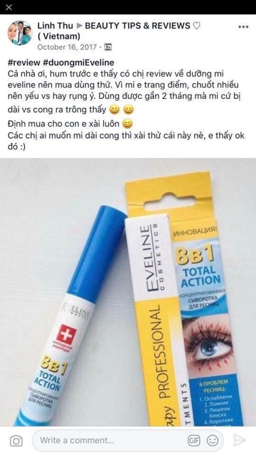Các nàng đã đọc review về em dưỡng dài mi nè chưa????? VỪA TỐT VỪA RẺ. Từ ngày nối mi bị rụng trơ trụi tớ đã phải tìm đủ các em dưỡng mọc mi. Trong đó có #Eveline! 💥Huyết thanh Dưỡng mi Eveline 8 in 1 Total Action Lash Therapy Professional💥 - Giải pháp cho những nàng có hàng lông mi dễ gãy , mỏng và cho những ai muốn có đôi mắt thướt tha hơn nhé😍💫. 🎀 Giá : 100k 📌Thương hiệu: Eveline. 📌Xuất xứ: Nga. 📌Dung tích: 10ml. 🌈Sản phẩm cải tiến mới nhất của hãng sau các bản 3in1 và 5in1. Chăm sóc và giải quyết 8 vấn đề về mi: 1. Yếu. 2. Giòn. 3. Không có độ bóng. 4. Ngắn. 5. Mỏng. 6. Nhạt màu. 7.Bị rụng, gãy. 8.Mọc chậm.. 💋 An toàn cho mắt, dùng được cho cả những người đeo kính áp tròng thường xuyên. 💋 Không chảy vào mắt gây cay mắt như các loại dầu thường thấy. 🚨Hướng dẫn sử dụng: Làm sạch mi. Dùng cọ của sản phẩm chải theo đường zich zắc từ trong ra ngoài và hướng lên trên để vừa dưỡng mi vừa định hình cho mi cong: 1/ Sử dụng như huyết thanh dưỡng và phục hồi: sử dụng mỗi ngày 2 lần buổi sáng và buổi tối trước khi đi ngủ. 2/ Sử dụng như lớp bảo vệ: chuốt mi trước khi chải mascara. ‼️Lưu ý: 🍃Làm sạch vùng mặt và mắt trước khi dùng. 🍃Ngay lập tức trên mi sẽ có màu bạc khi chuốt mi, sau vài phút khi tinh chất thẩm thấu, mi sẽ trở nên đen óng và dầy dài hơn. 🍃Cảm giác ngứa mi mắt có thể sẽ xuất hiện ngay lần sử dụng đầu tiên vì tinh chất kích thích tế bào sản sinh. Có thể giảm số lần sử dụng đến khi hiện tượng này dứt. 🍃Sau khi sử dụng tinh chất, không dụi mắt hay rửa mắt.