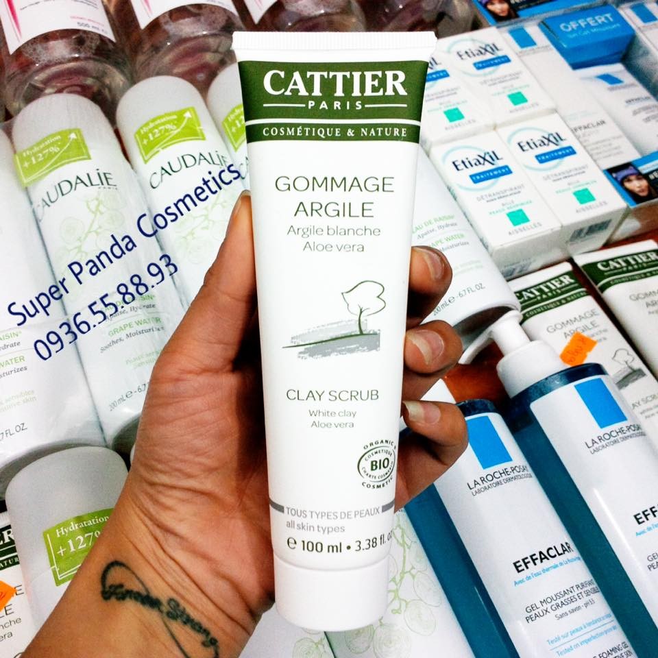 Tẩy Da Chết Cattier Gommage Argile Aloe Vera một trong những sản phẩm best-seller của thương hiệu dược mỹ phẩm Cattier – thương hiệu dược mỹ phẩm lâu đời của Pháp được bày bán ở các cửa hàng Bio (nơi chỉ bán các sản phẩm có thành phần nguồn gốc hữu cơ, an toàn và không gây kích ứng cho người sử dụng). Cattier Gommage Argile Aloe Vera scrub chứa đất sét trắng mềm mại giàu khoáng chất cùng với hạt scrub “mịn tơi” nhẹ nhàng tẩy tế bào chết dư thừa trên bề mặt giúp da sáng, mịn màng mà không đem lại cảm giác khô ráp sau khi tẩy da chết trên khuôn mặt. Đồng thời, tẩy tế bào chết 1-2 lần/tuần giúp bã nhờn tích tụ ở nang lông được “thanh tẩy” nhờ đó lỗ chân lông được thông thoáng, giảm thiểu mụn đầu đen, mụn cám và mụn đỏ. Điểm cộng cho em tẩy da chết đất sét này là thành phần vô cùng phong phú, dầu jojoba dưỡng ẩm và bảo vệ; hoa oải hương cùng lô hội giúp thanh lọc, làm dịu da; tinh dầu bạc hà thanh mát đánh thức giác quan giúp tinh thần được refresh như đang trải nghiệm quá trình Spa chuyên nghiệp. Tẩy Da Chết Cattier Gommage Argile Aloe Vera được đánh giá 4.7/5 trên makeuppalley Cách dùng: Sửa mặt sạch, làm ẩm để da được mềm sau đó lấy một lượng tẩy da chết đất sét thoa lên quanh mặt (trừ vùng mắt và môi) massage theo chuyển động tròn từ 1-2 phút. Rửa sạch lại với nước là bạn đã có làn da mát, mịn, rất refresh. Sử dụng 1-2 lần/ 1 tuần. Thích hợp với mọi loại da.