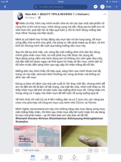 😘Miếng dán mụn Careplus của Olive Young có 2 loại màu xanh và màu vàng ( màu vàng mới ra mắt, có thêm thành phần mật ong manuka giúp sát khuẩn, làm lành vết mụn nhanh chóng) -1 hộp gồm: 4 tờ size 10mm, có 15 miếng dán/ tờ 2 tờ size 12mm, có 12 miếng dán/ tờ. Mình có tách lẻ từng tờ cho mn dùng thử nhé. 🥕🥕Với các thành phần nổi bật hỗ trợ làm dịu, kích thích đẩy và làm khô nhân mụn nhanh như đất sét cao lanh, tinh chất khuynh diệp, tinh chất quả sung, etc., OLIVER YOUNG PIMPLE COVER còn chứa Sodium Hyaluronate, Ceramide, tinh chất lô hội, tinh chất hoa cúc giúp làm lành vết thương, tái tạo làn da sáng đẹp nhanh hơn. 🥕🥕Màu sắc trong suốt phù hợp mọi loại da, độ dày 0,1 ~ 0,3mm, em này có khả năng bám dính cao, chống thấm nước rất tiện lợi ngay cả khi phải makeup mỗi ngày. Lúc trước m có dùng miếng dán mụn nexcare, cosrx nhưng tụi nó khá dày, lộ rõ trên mặt, dễ bong :(( nên mới mày mò xem có loại nào ngon bổ rẻ hơn không thì tìm được miếng dán careplus này của OY :v Vì sao m chọn nó: Careplus được no1 trên bxh GlowPick, được mấy bạn Hàn xài rất nhiều luôn, review toàn 4-5 sao, thấy bảo must-have item phải mua khi vào store của Olive Young 👍👍👍 Ưu điểm của miếng dán Careplus: 🌀 Bám dính tốt, rửa mặt, tắm xong vẫn không bị bong trừ khi bạn rửa nước quá kĩ :))) 🌀Mỏng, không bị lộ quá trên mặt. 🌀Có nhiều kích thước phù hợp từng loại mụn: 84 miếng ( 24 miếng to 12mm, 60 miếng nhỏ 10mm). 🌀Chất lượng tốt không kém cạnh các loại khác mà giá hợp lí hơn nhiều nếu tính ra thì em í rẻ hơn Cosrx, Nexcare luôn 😀 Bạn nào hay ngứa tay cạy mụn thì nên mua em này nha 😂😂