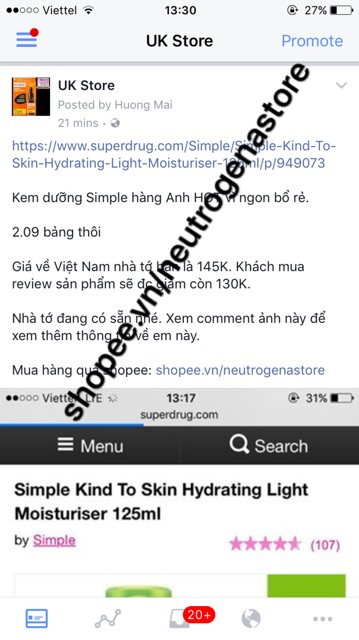 Theo thống kê từ hệ thống của MLEMBEAUTY, sản phẩm Kem Dưỡng Da Simple Skin To Hydrating Light Moisturiser 125Ml có hơn 643 lượt xem trong tháng này và có hơn 1425 lượt mua toàn thời gian cùng với 664 đánh giá tích cực với điểm đánh giá sao trung bình là ⭐⭐⭐⭐⭐ (5 sao). Bạn hãy yên tâm mua sản phẩm này nhé!