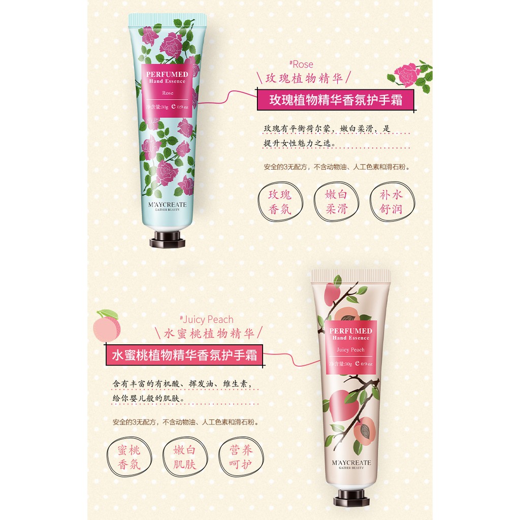Kem dưỡng da tay MayCreate Perfumed Hand Essence 30g Xuất xứ: Nội địa Trung Quốc Hãng sản xuất: MayCreate Quy cách: Tuýp 30g Sản phẩm kem dưỡng da tay đến từ hãng MayCreate có tác dụng như dưỡng da tay mềm mại, sáng da cũng như dưỡng cứng móng tay. Sản phầm rất thích hợp với các chị em làm công việc nội trợ, tính chất công việc cần đến sức lao động khiến da tay của chị em dễ bị khô ráp và gây cảm giác khó chịu. Còn gì tuyệt hơn khi các tuýp kem tay này có khả năng waterproof (chống thấm nước) Sản phẩm gồm các mùi: Đào ngon ngọt Trà xanh Bơ hạt mỡ Tinh chất bưởi, Hoa lan Nam Phi Mâm xôi rasberry (dâu rừng ) Xoài táo Hoa lily Hoa hồng tự nhiên Cây xiêm gai rừng .v.v... 1. Công dụng: - Sản phẩm kem dưỡng da tay đến từ hãng MayCreate có tác dụng như dưỡng da tay mềm mại, sáng da cũng như dưỡng cứng móng tay. - Sản phầm rất thích hợp với các chị em làm công việc nội trợ, tính chất công việc cần đến sức lao động khiến da tay của chị em dễ bị khô ráp và gây cảm giác khó chịu. - Còn gì tuyệt hơn khi các tuýp kem tay này có khả năng waterproof (chống thấm nước) 2. Phân loại: Sản phẩm gồm các mùi: - Juicy Peach: Đào ngon ngọt - Green Tea: Trà xanh - Shea Butter: Bơ hạt mỡ - Wild Berry: Quả dâu - Freesia: Hoa lan Nam Phi - Lily: Hoa lily - Rose: Hoa hồng - False Acacia: Cây xiêm gai rừng