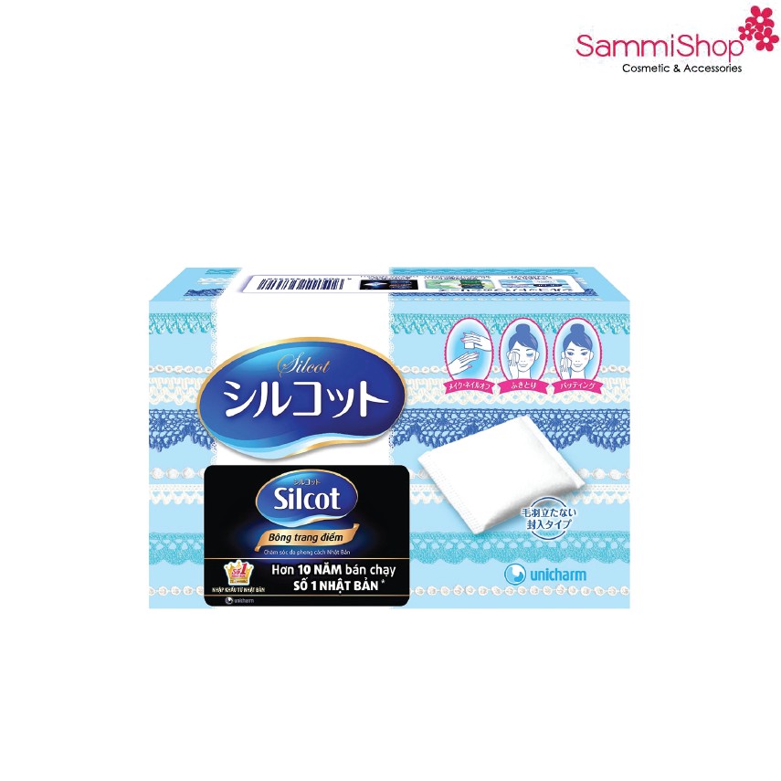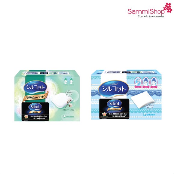 Bông tẩy trang Silcot – Sản phẩm bán chạy hàng đầu trong lĩnh vực bông trang điểm tại Nhật hơn 10 năm được sản xuất bằng công nghệ dệt sợi bằng nước của Unicharm Nhật Bản giữ độ mềm xốp và êm ái của bông khi tác động lên da. Bông có đặc tính mạnh nhất là tuyệt đối không xơ bông, không nát bông dù bạn có tác động lực mạnh đến đâu hay dùng cùng dụng cụ làm đẹp. -Bông Tẩy Trang Silcot thường (hộp màu xanh dương): 1 hộp 82 miếng Bông trang điểm Silcot được thiết kế dạng túi thông minh với 3 đặc điểm nổi bật: – Không xù bông, bụi bông, biến dạng bông hoặc để lại xơ bông trên mặt, đem tới cảm giác dễ chịu và thân thiện cho da. – Dàn đều và thấm hút dung dịch dễ dàng giúp tiết kiệm mỹ phẩm dưỡng da – Mềm mại và êm dịu với da: thích hợp với nhu cầu chăm sóc da cơ bản Bông Tẩy Trang Silcot cao cấp (hộp màu xanh lá): 1 hộp 66 miếng Bông trang điểm Silcot cao cấp được làm từ 100% bông tự nhiên, kết hợp với thiết kế dạng túi thông minh. – Bề mặt bông mềm mịn, êm ái và dịu nhẹ với da – Kết cấu sợi bông thấm dàn đều và tiết kiệm dung dịch dưỡng da – Điểm nhấn hình cỏ 4 lá dập trên phần đường viền bông – biểu tượng cho niềm hạnh phúc và may mắn