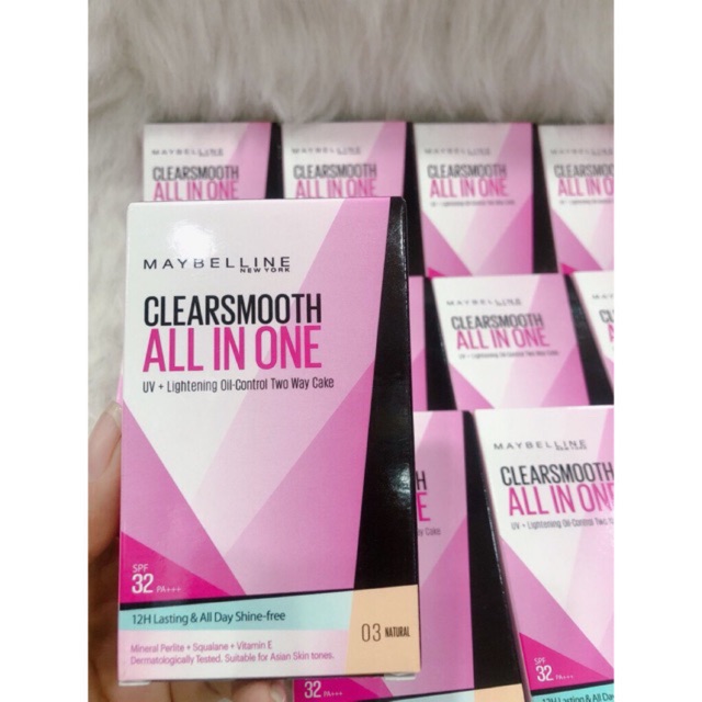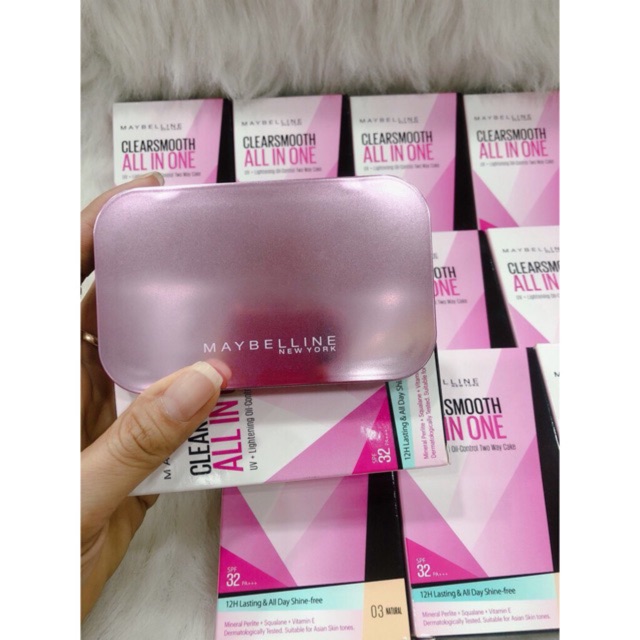 Phấn Trang Điểm Siêu Mịn 5 Trong 1 Maybelline Clearsmooth All In One UV + Lighttening Oil - Control Two Way Cake 9g với cấu trúc hạt phấn siêu mịn cùng độ bám cao sẽ che phủ khuyết điểm hoàn hảo. Công thức được phát triển với các tông màu phù hợp với làn da châu Á. Khả năng kiểm soát nhờ tốt hơn gấp 5 lần, giữ da không bóng dầu suốt 12h. Hạt phấn nhẹ hơn gấp 2 lần cho lớp nền thoáng mịn, không làm bí da. Chống nắng SPF 32 PA+++. Chứa vitamin E và các khoáng chất tự nhiên giúp sáng da. Loại da Phù hợp với mọi loại da. Tông màu Phấn Trang Điểm Maybelline Clear Smooth All In One gồm 3 tông màu: 01 Light - Dành cho da sáng, trắng 03 Natural - Màu tự nhiên, dành cho da trung bình hoặc muốn trang điểm nhẹ nhàng tự nhiên 04 Honey - Dành cho da trung bình ngăm Hướng dẫn sử dụng Dùng phấn ở dạng khô: Dùng cọ hoặc bông phấn để lấy sản phẩm, giũ nhẹ để rơi bớt phấn dư tránh tình trạng phấn đóng lớp không đều trên mặt. Tán phấn thật đều lên toàn bộ khuôn mặt theo chuyển động xoay tròn và lan dần xuống cổ. (Phủ phấn dưới cổ giúp đều màu da mặt và da cổ tránh tình trạng lệch tông). Dùng phấn ở dạng ướt: Sử dụng bông phấn đã nhúng qua nước và vắt ráo chỉ còn vừa ẩm. Sau đó dùng bông phấn lấy sản phẩm Maybelline, nên giũ bớt phần phấn thừa trước khi sử dụng. Dặm phấn đều khắp mặt và cổ. Với cách sử dụng này giúp phấn có độ bám và lặn vào da, giúp lớp trang điểm mịn mượt tự nhiên hơn.