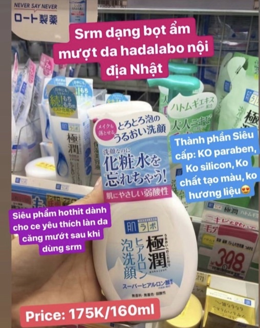 Sữa Rửa Mặt Tạo Bọt Dưỡng Ẩm Hada Labo Gokujyun Super Hyaluronic Acid Moisturizing Face Wash Xuất xứ: Nhật Bản Quy cách: chai 160ml Sữa Rửa Mặt Hada Labo Gokujyun Super Hyaluronic Acid Moisturizing Face Wash – Sữa rửa mặt tạo bọt với công thức dịu nhẹ cùng độ PH cân bằng, giúp nhẹ nhàng làm sạch da mà không gây khô căng, kích ứng Mô tả ***Đặc tính và công dụng: -- Khả năng làm sạch sâu nhờ lớp bọt nhỏ li ti còn có khả năng dưỡng ẩm tuyệt vời. -- Chiết xuất từ hạt lúa mạch ngọc trai giúp dưỡng ẩm, làm trắng da. -- Công thức “Super Hyaluronic Acid” giúp giữ ẩm, cho da mềm mại, không bị khô, căng rát khó chịu sau khi sử dụng. -- Độ pH dịu nhẹ, thành phần cực lành tính, không chứa cồn, không hương liệu, không chất tạo màu, không chứa silicon, an toàn với mọi làn da Thiết kế dạng chai vòi pump tròn trĩnh, nhìn rất cưng và có khả năng tạo bọt sẵn rất tiện lợi, tiết kiệm thời gian. ***Hướng dẫn sử dụng: Lấy một lượng vừa phải vào lòng bàn tay. Xoa đều và massage nhẹ nhàng để tẩy sạch bụi bẩn và bã nhờn. Rửa lại bằng nước sạch. #suaruamat #taobot #hadalabo