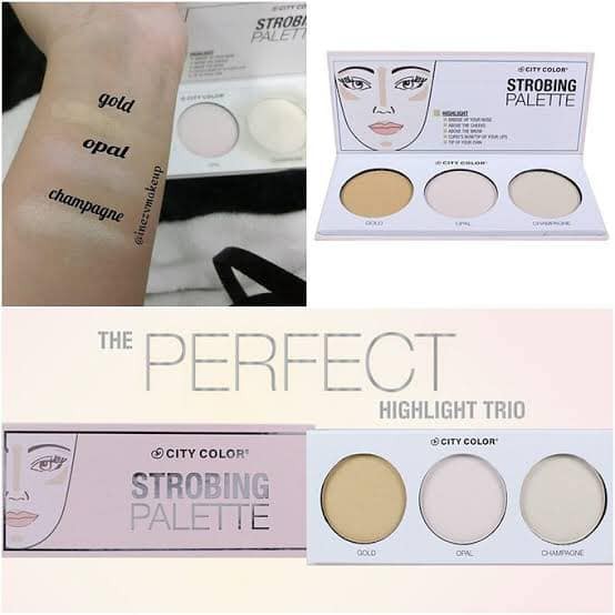 City color strobing palette - bảng highlight mới nhất của city color gồm 3 tone Gold, Opal, Champagne rất dễ dùng. Strobing là phương pháp trang điểm giúp cho khuôn mặt có chiều sâu và tạo được điểm nhấn. Nghe thì giống Contouring vì cả 2 phương pháp đều có mục đích chung, nhưng Contouring phải bắt buộc sử dụng đến các loại phấn tạo khối kết hợp với highlight khá cầu kỳ thì Strobing lại chỉ cần một hộp phấn highlight để tạo nên sự khác biệt nha 😉 🔺Phấn nhẹ, bám da tốt, cảm giác nhẹ nhàng ko bí da rất dễ chịu. 🔺Cách sử dụng: dùng tay hoặc cọ chấm vào phấn để đánh những vị trí như giữa trán, gò má, xương lông mày, sống mũi, môi và cằm.