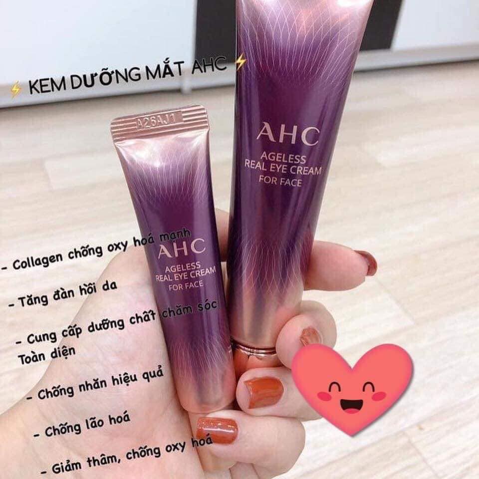 👀Kem mắt AHC e về sẵn rồi đây ạ, nàng nào lấy nhắn e ship luôn dùng ngay khỏi chờ đợi nhé . Khách e đã dùng rồi review cực tốt nên e cũng tậu 1 tuýp lớn 👀Kem dưỡng da vùng mắt AHC phiên bản mới nhất đang được sale 90% giá tốt quá tranh thủ AHC có đợt sale lớn e gom order cho mn yên tâm sử dụng ạ ❤️ 💁🏻Từ ngày dùng kem mắt e thấy mắt đỡ thâm nhìn đỡ mệt mỏi hơn vì e hay thức khuya, mà nhìn vùng da mắt kiểu đàn hồi ít bị nếp nhăn như xưa í . Nchung càng lớn da mắt càng lộ dấu hiệu lão hoá nên phải chăm kĩ tí hihi ➿ Đây là sản phẩm chăm sóc vùng mắt bán chạy nhất tại Hàn Quốc. Ngoài vùng da mắt có thể sử dụng để cải thiện nếp nhăn cho vùng khoé mũi, khoé miệng. Hoặc nếu thích có thể dùng cho da mặt như kem dưỡng cũng được luôn. ➿ Chứa hơn 10 loại peptite giúp ngăn ngừa, chống lão hóa da và săn mịn da. ➿ Chứa Niacinamide, Bifida, Glutathione làm trắng sáng da hữu hiệu. ➿ Chứa Collagen, Shea Butter, Ceramide... tăng độ đàn hồi, căng bóng da. ➿ Chứa Antitoxin, Sodium Hyaluronate... chống mất nước, giữ ẩm làn da. ➿ Chiết xuất trà xanh, rau má, protein sữa, dầu dừa và hơn 20 loại nấm, rễ cây quý giúp làn da khỏe mạnh, săn chắc và căng mịn. 🎯 Công dụng : - Giảm thâm quầng, làm sáng da. - Giảm bọng mắt. - Chống lão hóa da. - Ngăn ngừa nếp nhăn nhỏ và giảm các nếp nhăn sâu. - Da đàn hồi, săn chắc. - Dưỡng ẩm và chống mất nước da. - Phục hồi đôi mắt thiếu sức sống và mệt mỏi. Bên cạnh dùng kem dưỡng mắt cũng nên kết hợp ngủ đúng giờ và đủ giấc nữa để có hiệu quả tốt nhất.