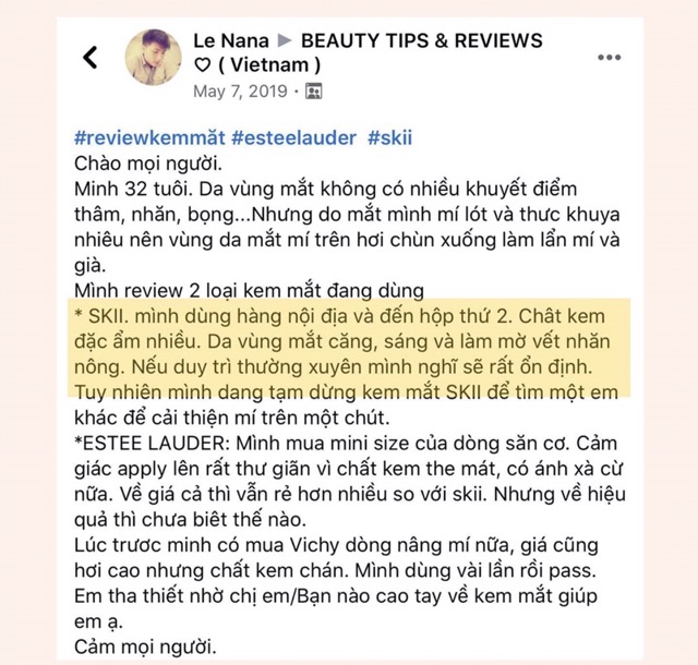 ❄️ĐỪNG BAO GIỜ TIẾC CHO VIỆC ĐẦU TƯ CHO KEM MẮT VÌ BẠN SẼ HỐI HẬN❄️ Cứ kem mắt mà đắt cỡ nào em cũng khuyên chị em phải đầu tư ngay và luôn ạ. Vùng da mắt lão hoá nhanh nhất để lại dấu hiệu tuổi tác rõ nhất 😢😢 Đã nhắc đến kem mắt cứ lên mạng search sẽ thấy 𝐒𝐊-𝐈𝐈 𝐑𝐍𝐀 𝐄𝐲𝐞 𝐂𝐫𝐞𝐚𝐦 được mn reccomend rất nhiều 🥰🥰 ✅ Vẫn công thức với tinh chất Pitera công nghệ nổi tiếng chống lão hoá trên thế giới của nhà Skii ✅ Bổ sung độ ẩm cho vùng da mắt, hạn chế tối đa hình thành các nếp nhăn khi cười, nheo mắt.. ✅ Quan trọng là phục hồi và tái tạo vùng da quanh mắt suốt cả ngày lẫn đêm luôn. Bảo vệ da bạn khỏi tác hại của tia UV. Cái này là em phải công nhận ạ. ✅ Trị thâm, nám xuất hiện quanh mắt. Kết hợp các động tác massage mắt còn làm giảm bọng mặt sưng húp. 👉🏻 Trên 23 tuổi cả nhà đã nên xài kem dưỡng mắt. Nếu có xiền chị e cứ đầu tư hẳn Skii không hối hận. Còn không thì có những em giá dễ chịu hơn như Clinique và Estee ạ. Cái nào phù hợp với túi tiêm của các nàng thì đầu tư ạ 🥰 👉🏻 Phải nói là kem mắt rất QUAN TRỌNG luôn. Hôm nào Annie quên kem mắt buổi sáng là y như rằng đến chiều da mắt sạm đi hẳn ạ 😢😢