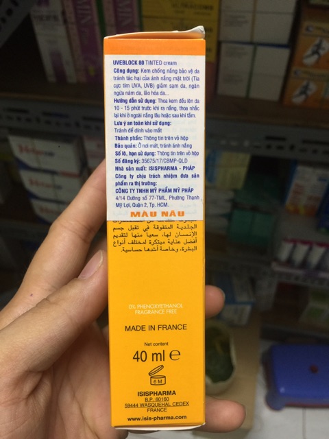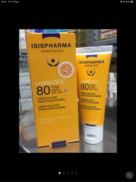 Kem chống nắng bảo vệ tối đa cho da nhạy cảm Uveblock SPF 80 Invisible - Kem chống nắng thế hệ mới được sản xuất tại Pháp có tác dụng: Bảo vệ da và ngăn ngừa sạm da sau khi sử dụng các phương pháp điều trị liệu kỹ thuật cao I.P.L, Laser..... Ngăn ngừa sạm da tái phát sau trị liệu sạm da. Bảo vệ da tránh những tác hại của tia cực tím, đặc biệt với làn da nhạy cảm với ánh nắng. Bảo vệ cấu trúc bên trong của da, duy trì các hoạt động sinh lý bình thường của da. Ngăn ngừa sạm da, lão hoá da, bảo vệ vùng da non khi đi ra nắng. Kem chống nắng bảo vệ da tối đa Uveblock SPF 80 Invisible Ưu điểm vượt trội của kem chống nắng bảo vệ tối đa cho da nhạy cảm Uveblock SPF 80 Invisible: Chỉ số chống nắng SPF rất cao,chống tia cực tím UVA-UVB. Không gây kích ứng da. Bảo vệ da hiệu quả, an toàn. Không màu, không gây tình trạng bóng nhờn, độ bám dính tốt, không bị trôi khi đi mưa hoặc ra mồ hôi. Không mùi, dễ tẩy rửa ,không bít lỗ chân lông. Kem chống nắng bảo vệ da tối đa Uveblock SPF 80 Invisible Hướng dẫn sử dụng kem chống nắng bảo vệ tối đa cho da nhạy cảm Uveblock SPF 80 Invisible: Thoa kem đều lên da 15-20 phút trước khi ra nắng. Thoa nhắc lại khi ở ngoài nắng lâu, sau khi tắm. Có thể dùng như lớp lót khi trang điểm. Sử dụng tốt nhất khi đi biển hoặc đi dã ngoại. Quy cách: tuýp 40ml. Bảo quản: nơi khô ráo, thoáng mát, tránh ánh nắng trực tiếp. Xuất xứ: Pháp Sản xuất bởi: Isispharma, B.P.60180 59444 Wasquehal Cedex, France.