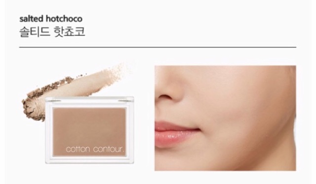 Missha Cotton Blush , Contour có kết cầu lì, mềm, không bết bột tăng hiệu quả pha trộn màu sắc mềm mại. Màu sắc sống động, tự nhiên, trong suốt. Phấn mướt, đàn hồi giúp kiểm soát bã nhờn hiệu quả Có sẵn phấn má màu cam đất, highlight , tạo khối