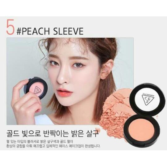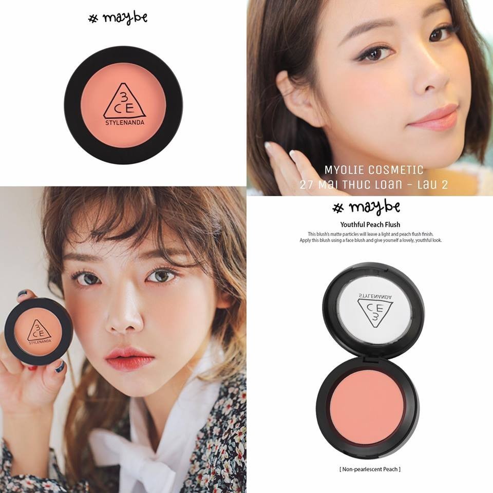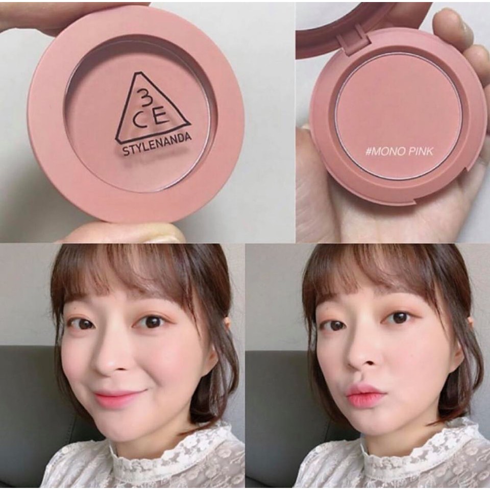 Bảng màu: 1. Nude peach: đào sữa 2. Mono pink: hồng đất, pha chút ánh cam 3. Rose beige: cam hồng đất 4. Full of charm: cam hồng sữa 5. Soft salmon: cam sữa 6. Peach splash: cam nude 7. Puke care: hồng nude Phấn má hồng 3CE Face Blush thuộc thương hiệu 3CE. Bên cạnh đó, 3CE vừa tung ra thị trường dòng son mà cả thế giới săn lùng tìm kiếm và ưa thích. Bởi vậy mà Phấn má hồng 3CE Face Blush được nhiều chị em Châu Á tin dùng vì màu sắc tự nhiên, độ bám cao và giữ màu lâu. Có thể thấy Phấn má hồng 3CE Face Blush Stylenanda không chỉ mịn hơn các dòng phấn má thông thường mà còn vượt quá quy định về độ đẹp. Bột phấn được nghiền rất mịn, khi lướt trên da không gây dính rít, khó chịu. Đồng thời đem lại cho bạn một đôi gò má mịn màng và không bị bột như các sản phẩm khác. Thậm chí sẽ không còn nhận ra mình đang trang điểm. Đặc biệt, lớp phấn rất ăn vào da, không gây cakey cho bạn đôi má hồng hào tự nhiên không gây giả tạo. Hơn thế nữa, phấn có khả năng hút dầu nhờn đem lại cho bạn có làn da khô thoáng cả ngày, nhưng không gây hại cho làn da. Phấn có dạng lì, không nhũ, không bóng nên bạn có thể dùng phấn má 3CE hằng ngày mà không lo lớp trang điểm quá lố.