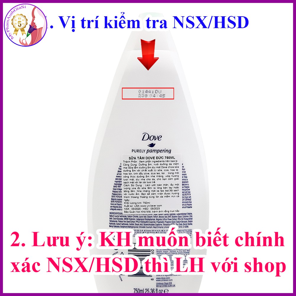 SỮA TẮM DOVE ĐỨC 750ML - NEW Dung tích: 500ml Xuất xứ: Đức Thương hiệu: Dove SỮA TẮM DOVE ĐỨC 750ML - NEW Công dụng: Dưỡng ẩm, nuôi dưỡng da mềm mại Sữa tắm dưỡng ẩm dịu mát Dove chứa sữa dưỡng ẩm với chiết xuất từ sữa, dừa, hoa lài, hoa lan, tinh dầu olive, dưa leo, bơ… trong một công thức dưỡng ẩm nhẹ nhàng, ướp hương tươi mát, dịu nhẹ cho da, cho bạn cảm giác sạch mát với làn da tươi trẻ. Đặc biệt “Sữa tắm Dove – tốt hơn cả sữa” có chứa hợp chất Nutrium MoistureTM- hỗn hợp độc đáo gồm dưỡng chất dưỡng ẩm kết hợp với lipid tự nhiên của da, thẩm thấu hiệu quả để nuôi dưỡng làn da tận sâu bên trong, cho bạn một làn da luôn tươi trẻ và căng tràn sức sống. Ngoài ra Dove còn chứa 1/4 kem dưỡng ẩm, giúp nuôi dưỡng, bảo vệ làn da của bạn, Dove sẽ không làm khô da hay kích ứng như xà phòng. Sử dụng sữa tắm Dove bạn sẽ cảm nhận được một làn da mịn màng, trắng sáng mà không nhờn rít suốt cả ngày.. Sữa tắm toàn thân giúp dưỡng ẩm, tái tạo da, nhanh chóng đem đến cho bạn làn da mịn màng. Thương hiệu Dove là biểu tượng cho “vẻ đẹp tự nhiên thuần khiết” và không hề mang đến những khuôn mẫu thông thường hay những cam kết vượt quá khả năng thực hiện của mình. Là phụ nữ, hẳn bạn biết cách dùng sữa tươi để tắm làm đẹp da, thậm chí có thể bạn đã từng tắm sữa, nhưng đã bao giờ bạn chợt nghĩ: “sữa tươi đã hết thời”? Đặc biệt “Sữa tắm Dove – tốt hơn cả sữa” có chứa hợp chất Nutrium MoistureTM– hỗn hợp độc đáo gồm dưỡng chất dưỡng ẩm kết hợp với lipid tự nhiên của da, thẩm thấu hiệu quả để nuôi dưỡng làn da tận sâu bên trong, cho bạn một làn da luôn tươi trẻ và căng tràn sức sống. Bạn sẽ không còn lo lắng khi lựa chọn sữa tắm cho làn da của mình. Ngoài ra Dove còn chứa 1/4 kem dưỡng ẩm, giúp nuôi dưỡng, bảo vệ làn da của bạn, Dove sẽ không làm khô da hay kích ứng như xà phòng. Sử dụng sữa tắm Dove bạn sẽ cảm nhận được một làn da mịn màng, trắng sáng mà không nhờn rít suốt cả ngày. Hướng dẫn sử dụng : - Bước 1: Làm ướt toàn thân, lấy một lượng vừa đủ sữa tắm ra lòng bàn tay hoặc bông tắm. Nhẹ nhàng mát xa tạo bọt. - Bước 2: Xả sạch với nước ấm. Bạn sẽ cảm nhận được hương thơm thoang thoảng cùng làn da mềm mịn cả ngày. Sau đây là shop hướng dẫn cụ thể việc kiểm tra Nguồn Gốc-Xuất xứ -Ngày sản xuất và Hạn sử dụng của sản phẩm thông qua các hình ảnh Shop kiểm tra mẫu minh họa chi tiết cho khách hàng. --------------------------------------------- #suatamdoveduc750mlnew2018 #suatam#dove#duc750mlnew #suatamdoveduc750ml #suatamdoveduc #suatamdove #suatam #dove