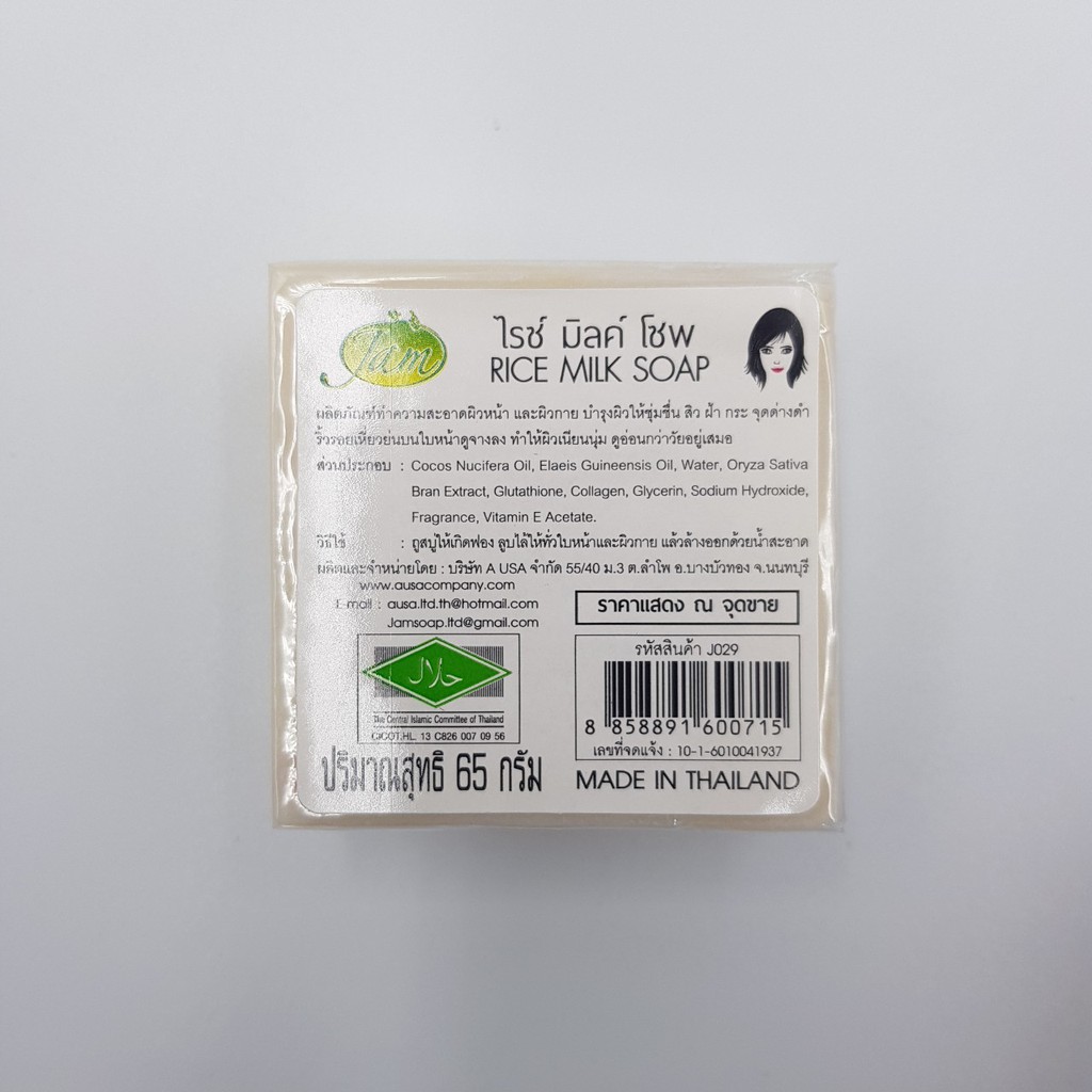 Xà phòng gạo jam Thái Lan Hãng sản xuất : Ausa Xuất xứ: Thái Lan Trọng lượng : 65g Thành phần: Rice Milk Extract, VitaminB3, VitaminE, dầu oliu, dầu cọ, Glycerin tự nhiên. Dùng thay thế sửa rửa mặt hoặc tắm toàn thân đều được - An toàn, dùng được cho phụ nữ mang thai - Thích hợp mọi loại da, kể cả da khô và da nhạy cảm - Dùng để rửa mặt hoặc tắm toàn thân Tác dụng Giúp loại bỏ bụi bẩn, tẩy tế bào chết, làm trắng da mặt và cơ thể Vitamin trong sửa gạo giúp da sáng lên và mềm mại Cách sử dụng: Làm ướt da mặt ( hoặc cơ thể ) chà 1lớp xà phòng, massage nhẹ nhàng 2-3 phút rồi rửa sạch. Bạn sẽ cảm nhận sự khác biệt sau lần rửa đầu tiên