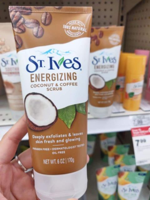 TẨY DA CHẾT ST.IVES RISE & ENERGIZE COCONUT & COFFEE SCRUB 170g ✅Chiết xuất từ dừa và cà phê giúp làm giảm kích ứng và mẩn đỏ do mụn gây ra. Giúp da khỏe mạnh, mịn màng, trắng sáng rạng rỡ. Làm sạch mụn, không gây bóng dầu, nhờn da. ❎Với các hạt cát mịn massage nhẹ nhàng tẩy đi tế bào chết trên da. 🍃Loại bỏ những bụi bẩn gây bít lỗ chân lông.Sản phẩm phù hợp với mọi loại da, đặc biệt là da khô. ❗️Cách dùng: - Sau khi làm ướt da bằng nước, bạn lấy 1 lượng vừa đủ sữa rửa mặt St.Ives Coconut & Coffee cho vào lòng bàn tay và tạo bọt, massage nhẹ nhàng trong vòng 30s, sau đó rửa sạch lại với nước.