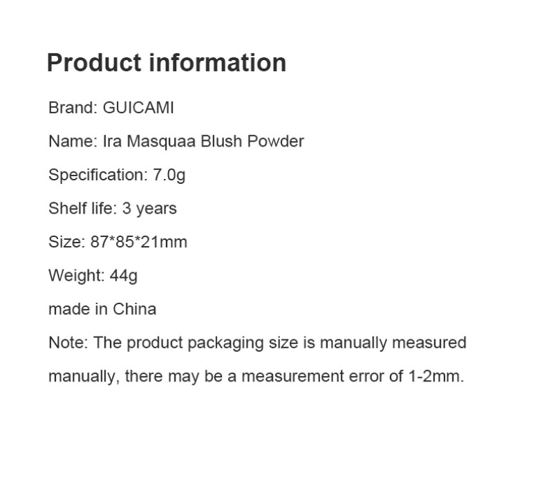 Package Included: 1*blush Specifications: The powder is fine and silky, clear and not greasy. The color is full, the color is rich, and the color is high. It has good waterproof and sweat-proof effect, is not easy to smudge, does not easily fall off, and can last for a long time. Many colors are available. Small and light, easy to carry. Suitable for various occasions. Description: 100% brand new and high quality products. The powder is fine and silky, clear and not greasy. The color is full, the color is rich, and the color is high. It has good waterproof and sweat-proof effect, not easy to smudge, and not easy to lose makeup. Long lasting makeup. Many colors are available. Small and light, easy to carry. Specification: Applicable people: general Skin Type: General Net content: 7g Shelf life: 3 years Product color: as shown Notes: Due to the difference between different monitors, the pictures may not reflect the actual color of the item. Compare the detail sizes with yours, please allow 1-3cm error, due to manual measurement. Please leaving a message before you give the bad feedback, if the products have some problems. Thanks for your understandings.