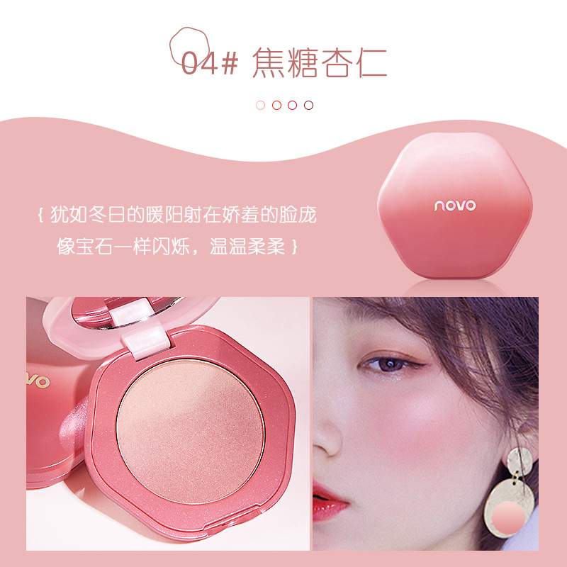 Brand type: national goods brand Imports: no Brand: novo For skin: universal Color: monochrome Model: novo5348 blush Specification: normal specification Net content: 6g Special purpose cosmetics: no Production license number: cantonese makeup 20160269 Cargo number: novo5348 blush Color number: 1#Powder cherry blossom, 2#Peach orange, 3#Fire clouds, 4#Caramel almonds ,,,,, Main sales areas: africa, europe, south america, south-east asia, north america, north-east asia, middle east Yes Whether cross-border exports are intended solely for source: yes Non special cosmetic filing number: guangdong g makeup net preparation word 2020012345 Shelf life: 3 years Cross-border parcel weight: 0.044 kg Unit weight: 0.044 kg