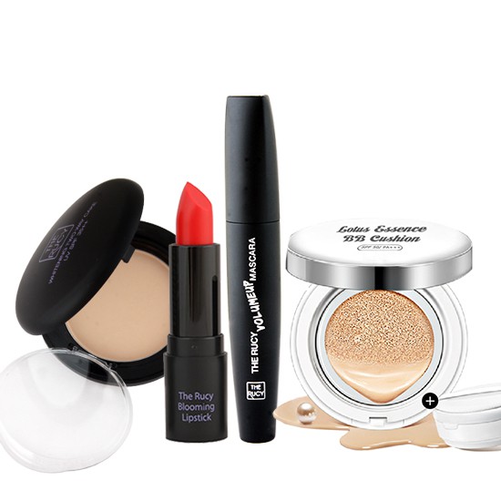 Bộ combo gồm: 1. Son Matte bền màu The Rucy Blooming Lipstick 3.5g Xuất xứ: Hàn Quốc. Công dụng: Dòng son matte cao cấp, chất son mềm mịn có khả năng bám màu bền, giữ được son lâu phai.Đặc biệt, được tăng cường các thành phần dưỡng môi tự nhiên từ Vitamin E, dầu hạt thầu dầu, sáp cây cọ… Thành phần: Diisostearyl Malate, Triethylhexanoin, Caprylic/ Capric Triglyceride, sáp tổ ong, sáp Candelilla, sáp Carnauba, Titanium Dioxide, dầu Castor, dầu thực vật, Silica,... Cách Sử dụng: Sử dụng son dưỡng ẩm (lipbalm) làm mềm môi trước khi dùng cọ lấy son matte hoặc thoa trực tiếp lên môi. 2. Phấn phủ trang điểm The Rucy Xuất xứ: Hàn Quốc. Công dụng: Phấn phủ trang điểm The Rucy dạng nén cao cấp đa năng với công thức 3 trong 1: phấn phủ, dưỡng trắng da và chống nắng an toàn từ thiên thiên. Thành Phần: Talc, Mica, Titanium Dioxidem, Methyl Methacrylate Crosspolymer, Mineral Oil, Caprylic/Capric Triglyceride, Silica,... HDSD: Lấy một lượng phấn vừa đủ vào bông phấn/ chổi rồi chấm nhẹ và đều khắp mặt, chuyển động theo hướng đi xuống. Dị ứng: Sản phẩm thích hợp mọi loại da. 3. Phấn nước trang điểm The Rucy Lotus Essence Cushion 13g Xuất xứ: Hàn Quốc. Công dụng: Phần nước cao cấp siêu mịn Lotus Essence BB Cushion có kết cấu dạng lỏng, che khuyết điểm tốt, kiểm soát dầu nhờn và không gây bí da. Thành phần: Tinh dầu hoa sen, Niacinamide, Stearic acid, Adenosine, chiết xuất võ dâu tầm, trà xanh, lá lô hội ,Zinc Oxide, Titanium Dioxide,… Cách sử dụng: Dùng bông phấn ấn nhẹ miếng mút trong hộp phấn, và thoa nhẹ khắp vùng mặt và cổ. 4. Mascara The Rucy Làm Cong Và Dài Mi 12g Xuất xứ: Hàn Quốc. Công dụng: Mascara chứa nhiều dưỡng chất thích hợp cho mắt có tác dụng làm dài và cong mi, để lại ấn tượng cho đôi mắt sâu và cuốn hút. Thành Phần: Water, Acrylates Copolymer, Beeswax, Triethanolamine, Propylene Glycol, Methylparaben, Phenoxyethanol,... HDSD: Lắc nhẹ cây Mascara trước khi dùng, mở nắp dùng cọ vuốt lên hàng mi trên một lượng vừa đủ,gần hốc mắt và từ từ tiến về cuối đuôi mi.