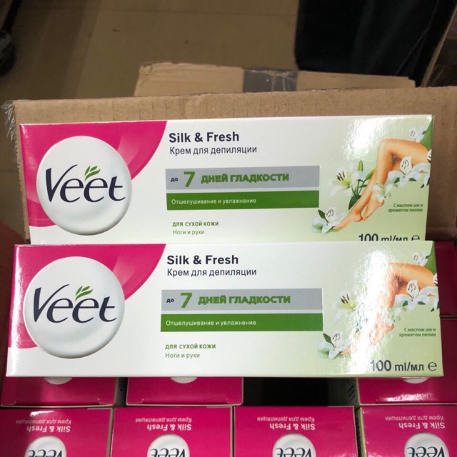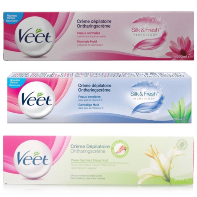 KEM TẨY LÔNG VEET PHÁP 100ML Công dụng: - Tẩy sạch lông cứng, làm nhạt màu lông. - Với chiết xuất từ thực vật giúp làn da mềm mịn và không gây khô rát khi sử dụng. - Không gây đau đớn cho da như sáp nóng hay máy cạo lông. - Hiệu quả lâu dài không gây hại cho da, không làm đỏ da, sước da... - Các hoạt chất có trong kem sẽ giúp tẩy lông tận gốc. Bạn có thể giữ được làn da sạch bóng lông trong khoảng 3 tuần đến 6 tháng. Nha đam: Dành cho da nhạy cảm Hoa cúc: Dành cho da thường Hướng dẫn sử dụng: - Dùng thìa nhựa thoa kem đều với lượng vừa đủ để che lông. - Sau 5 phút, lấy thìa để kiểm tra trên một khu vực nhỏ của da đã được phủ kem xem lông đã tẩy được chưa: + Nếu lông được tẩy thì tiến hành gạt phần kem còn lại. + Nếu lông chưa tẩy được thì để kem lâu hơn một chút mà không vượt quá 10 phút sẽ gây cảm giác kích ừng và bỏng rát - Rửa sạch da lại với nước sau khi sử dụng kem tẩy lông Veet, sau đó lau khô da. #Khác