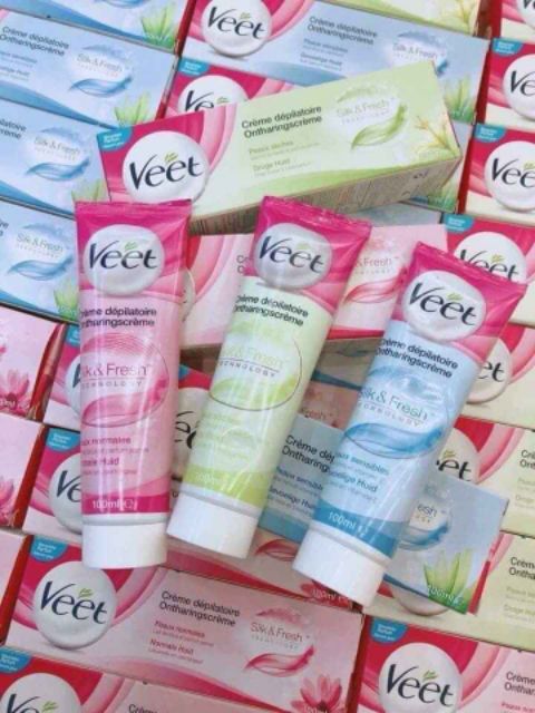 Kem tẩy lông veet về Đủ 3 màu Hàng chuẩn 100% 💧 Kem Tẩy Lông Veet của Pháp 💦👌 ➡ Loại màu hồng: Dành cho da thường ➡ Loại màu xanh: Dành cho da nhạy cảm (vùng kín, nách, ria mép, chân tay) ➡ Loại xanh lá: Dành cho da khô ✔️ Đặc tính và Công dụng: 👉Tẩy sạch lông cứng, làm nhạt màu lông. 👉Với chiết xuất từ thực vật giúp làn da mềm mịn và không gây khô rát khi sử dụng. 👉Không gây đau đớn cho da như sáp nóng hay máy cạo lông. 👉Hiệu quả lâu dài không gây hại cho da, không làm đỏ da, xước da… 👉Các hoạt chất có trong kem sẽ giúp tẩy lông hiệu quả. Bạn có thể giữ được làn da sạch bóng lông trong khoảng 3 tuần đến 6 tháng. ***Hướng dẫn sử dụng: 👉 Rửa sạch vùng da cần tẩy lông và để khô thoáng 👉 Dùng thìa nhựa tán 1 lượng kem vừa phải lên vùng da ấy, để yên ít nhất là 5′ (không quá 10′ nhé) 👉 Vẫn dùng thìa ấy gạt trước 1 vùng nhỏ để xem lông được loại bỏ hết chưa, nếu rồi thì gạt hết những vùng còn lại 👉Rửa lại với nước sạch, tuyệt đối không để kem còn dính lại trên da. Lưu ý: – Sau 72 giờ mới có thể áp dụng tẩy lông lần nữa. – Sau khi sử dụng, đợi 24 giờ mới dùng mỹ phẩm, kem, bơi lội hoặc tắm nắng. – Thêm một lưu ý nho nhỏ cho các nàng mới trải nghiệm lần đầu: Để tránh trường hợp bị kích ứng với các thành phần trong kem thì các nàng nên thử ở 1 vùng da nhỏ trước nhé.