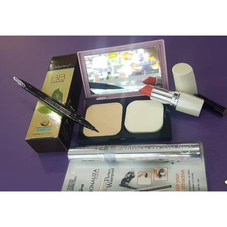 Mỹ Phẩm SKINSHOP xin giới thiệu bộ trang điểm chính hãng GIÁ SỐC 350K bao gồm 5 món : 1. Kem Nền Siêu Mịn BB Cream Ốc sên Mayfiece 50ml. Che khuyết điểm một cách hoàn hảo và tự nhiên còn có tác dụng cải thiện nếp nhăn, mờ đi vết thâm và làm trắng da 2. Phấn Trang Điểm Siêu Mịn 5 Trong 1 Maybelline Chống nắng SPF 32 PA+++ chứa vitamin E và các khoáng chất tự nhiên giúp sáng da 3. Mascara Mira Monaliza giúp cho đôi mi cong tự nhiên Hàn Quốc 9ml 4. Chì 2 đầu Kẻ Mày Ngang và bút nước Novo Makeup Seduce 5. Son Mistine 12h Long Last Lipstick vitamin E và dầu hạt Hoa hướng dương