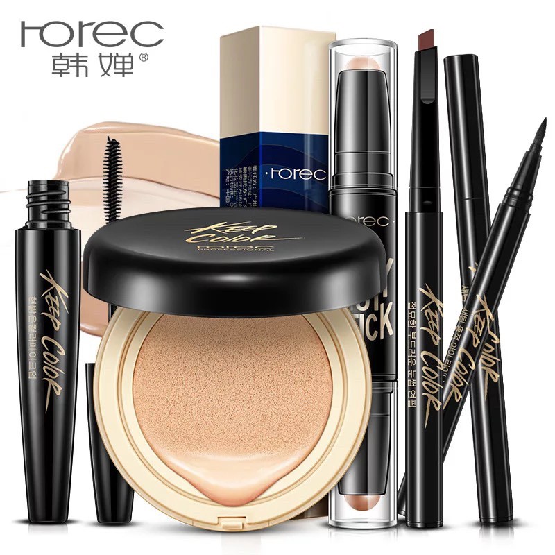 BỘ TRANG ĐIỂM ROREC 5 MÓNXuất xứ: Đài Loan Gồm 5 Sản Phẩm: + Chì kẻ chân mày đầu chì dạng ngang định dạng chân mày, cọ bột giúp tán đều cho nét mày đầy đặn, tự nhiên, mềm mại. + Bút kẻ mắt BIOAQUA cải tiến với đầu cọ sắc nét chỉ 0.01mm, cực kì linh hoạt giúp bạn dễ dàng vẽ mắt từ nét mỏng tự nhiên đến dày cá tính. Công nghệ màng phim độc đáo không lem, không trôi suốt 17 giờ lại hoàn toàn dễ tẩy trang. + Mascara BIOAQUA đầu cọ mới vuốt mi cong vút 100º, chải từng sợi cho mi tơi, dày đều. Dạng gel đặc biệt, nhẹ, mượt giữ mi cong suốt 18h, mi dày gấp 3 lần, không vón cục, không lem, không trôi. + Tạo khói bắt sáng dạng thỏi giúp gương mặt được nhấn sáng trở nên thon gọn, căng mướt sắc sảo nhưng vẫn tự nhiên. + Phấn nước nền với khả năng che phủ hoàn hảo giúp che phủ tốt các khuyết điểm trên da. Duy trì lớp trang điểm trong thời gian dài mà không xảy ra hiện tượng xuống tông khiến khuôn mặt bị tối. Phấn tạo cảm giác da mướt, mượt mà không bị mốc hay khô da. Độ kiềm dầu tốt, phù hợp với cả bạn da dầu hay hỗn hợp dầu đến da thường. Kết cấu kem mềm mỏng mịn giúp tăng khả năng bám trên da và không bị bết dính.