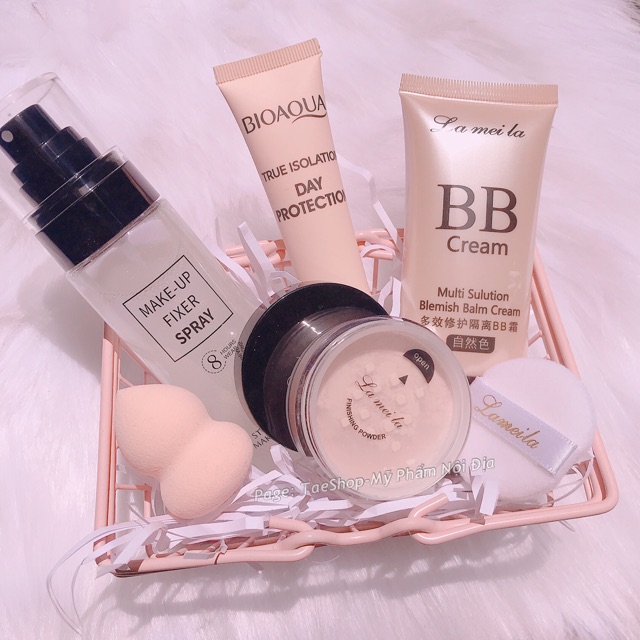 BỘ MAKEUP 5 MÓN CƠ BẢN❣️ ❣️ Xịt khoá nhũ makeup ❣️ Kem nền che phủ ❣️ Kem lót dưỡng ẩm ❣️ Phấn phủ kiềm dầu ❣️ Mút tán kem nền