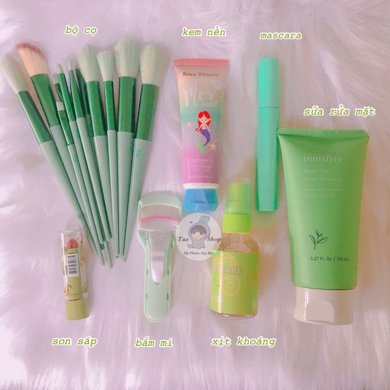 Set tone xanh : 💚 Bộ cọ 13 cây 💚 Kem nền 💚 Mascara 💚 Sữa rửa mặt 💚 Xịt khoáng 💚 Bấm mi cong 💚 Son sáp
