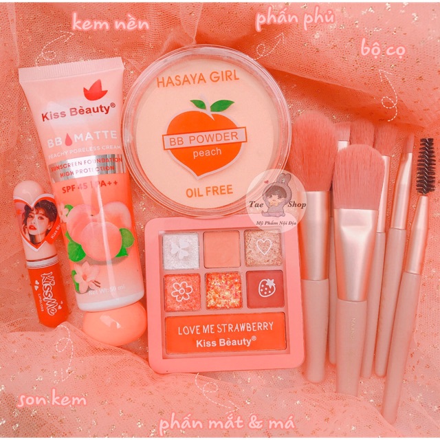 SET MAKEUP 5 MÓN SIÊU ĐƠN GIẢN LẠI VÔ CÙNG CẦN THIẾT 🍑 - Kem nền đào - Son kem - Phấn phủ kiềm dầu - Phấn mắt & má & nhũ - Bộ cọ 7 món