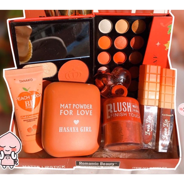 Set gồm 1 bảng mắt valentine any lady 1 kem lót peach or orange. 1 phấn nền phủ 1 má hồng bột 2 son kem lì ..............