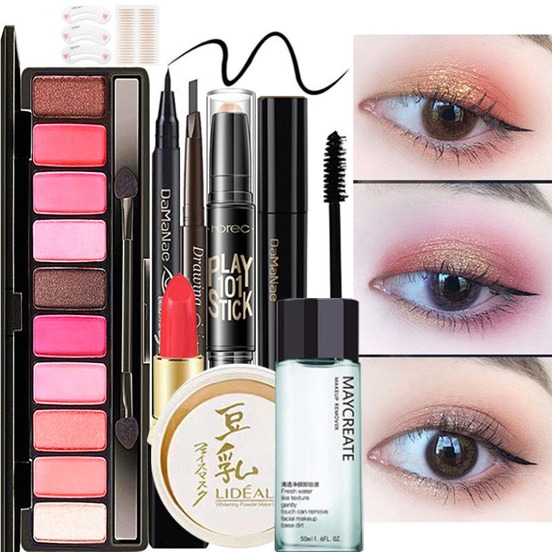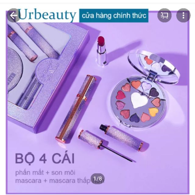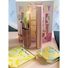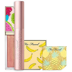 MPUSA Set makeup này gồm 4 món: 1. Phấn bronzer highllight lấp lánh có mùi như dứa ngọt ngào và có thể được trộn lẫn với nhau để tạo ra một ánh làn da sáng khỏe. 2. Phấn phủ It's Bananas Brightening Setting Powder phấn màu vàng làm sáng và làm mờ các nếp nhăn trên da với các tông màu vàng khi được đặt trên các điểm cao của khuôn mặt để tạo độ bóng mờ. 3. Son nhũ Juicy Fruits Comfort Lip Glaze, son bóng lấp lánh và độ mịn màng. Có thể sử dụng một mình hoặc apply trên lớp son khác. 4. Mascara Too Faced Better Than Sex Mascara , với công thức FILM-FORMING POLYMER-LOCKS cuộn tròn vào từng sợi mi làm cho hàng mi dày cong vuốt mang lại 1 hàng mi thật quyến rũ