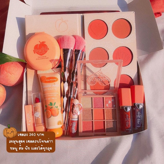 Set gồm 1 bảng má hồng 6 ô 1 bảng màu mắt 9 ô 2 son kem trái tim 2 son thỏi tanako 1 son kem kiss me 1 bộ cọ 4 cây 1 lót peach or orange 1 phấn nền peach