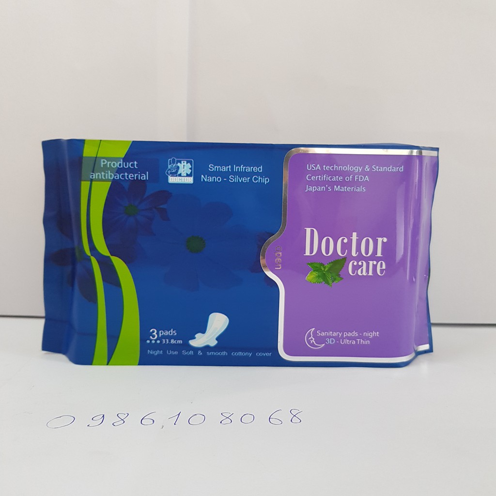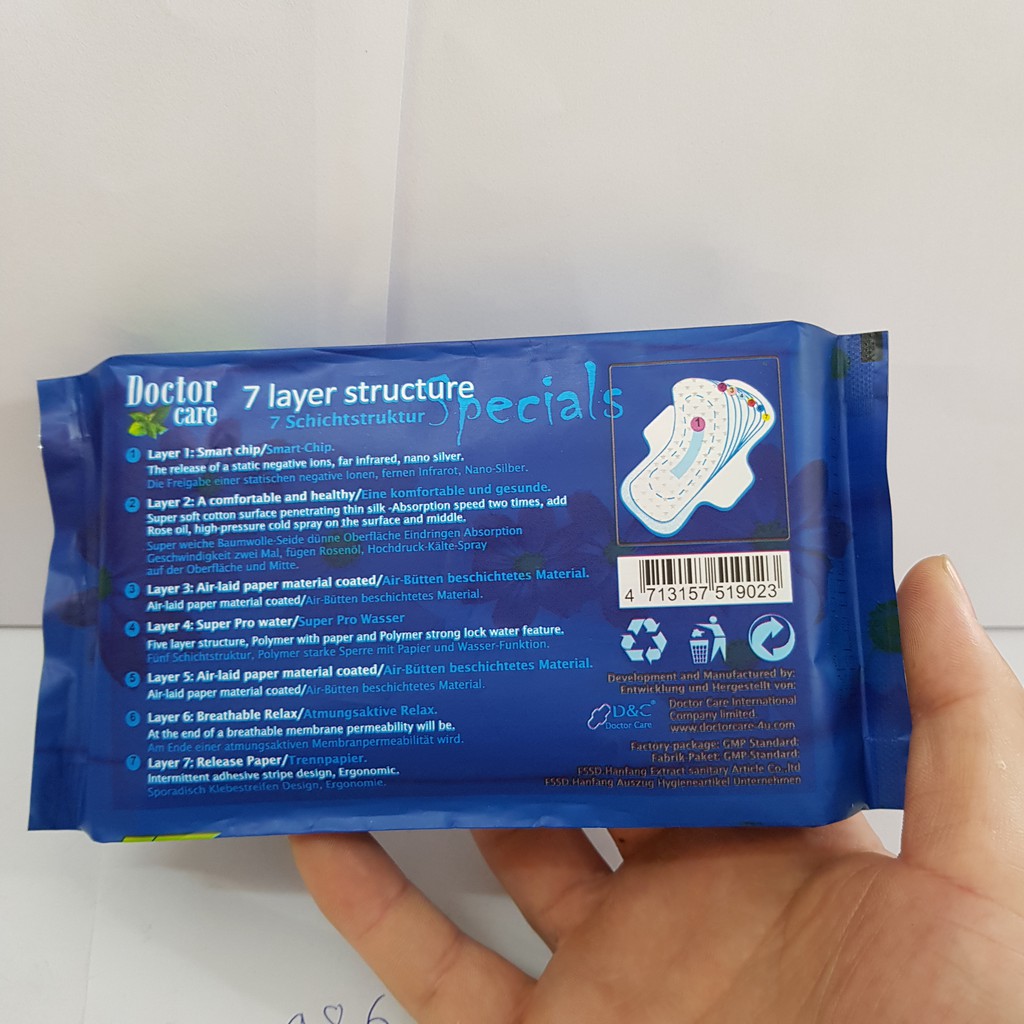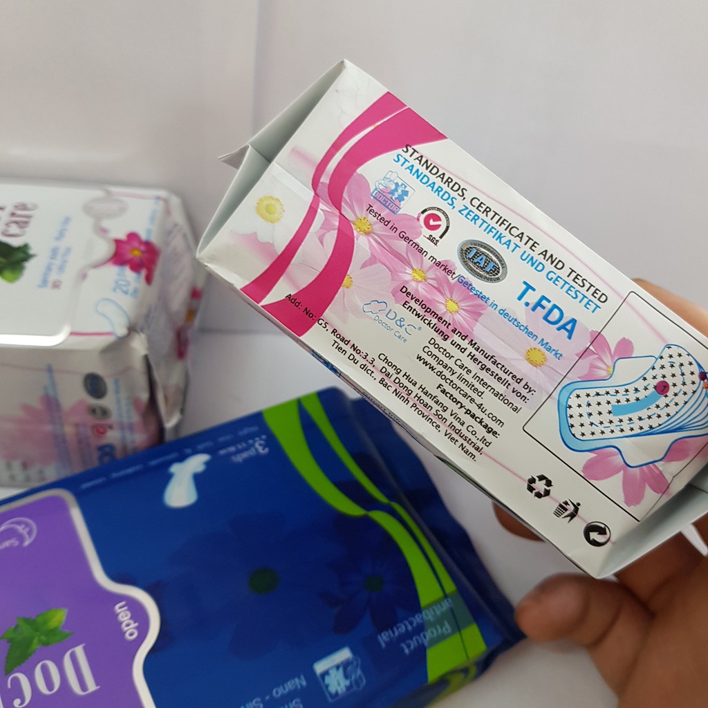 Thương hiệu: Doctor Care Xuất xứ: Đài Loan Quy cách đóng gói: - Ban đêm: 3pcs/ 1 gói ( 33,8cm) - Ban ngày: 8pcs/ 1 gói ( 24cm) - Hàng ngày: 20pcs/ 1 gói ( 16cm) Băng vệ sinh thảo dược Doctor care là sản phẩm của Doctor care International được nhập khẩu và phân phối bởi Doctor Care Việt Nam. Doctor care là băng vệ sinh nhập khẩu 100%, được sản xuất trên dây chuyền công nghệ đạt tiêu chuyển FDA Hoa Kỳ (US FDA), FDA Đài Loan (Taiwan FDA) tại Đài Loan (Taiwan). Nguyên liệu được nhập khẩu từ Nhật bản (Japan), với cấu tạo bề mặt bằng cotton không dệt và giấy polymer công nghệ cao siêu thấm, cấu trúc 3D – 7 lớp độc lập, siêu nhẹ, siêu thấm hút và đặc biệt có lớp đáy khí thở tạo sự thoáng khí, sạch sẽ, tự tin khi dùng. Điểm đặc biệt của bvs Doctor care là có chứa các thành phần thảo dược thiên nhiên như: Tinh chất bạc hà, tinh chất lô hội, tinh chất cây diếp cá, long não hương và các I-on âm vừa mang lại cảm giác the mát thích thú, tự tin, sảng khoái vừa hỗ trợ bảo vệ sức khỏe trong kháng khuẩn, phòng ngừa bệnh phụ khoa. Bvs Doctor Care đã được chứng nhận tại Việt Nam như: Chứng nhận chất lượng của Trung Tâm Kỹ Thuật Đo Lường Chất Lượng I – Tổng Cục Tiêu Chuẩn Đo Lường Chất Lượng, Viện Thực Phẩm Chức Năng – Trung Tâm Kiểm Nghiệm Và Hợp Chuẩn và các chứng nhận Quốc tế như: FDA, GMP, SGS, IA