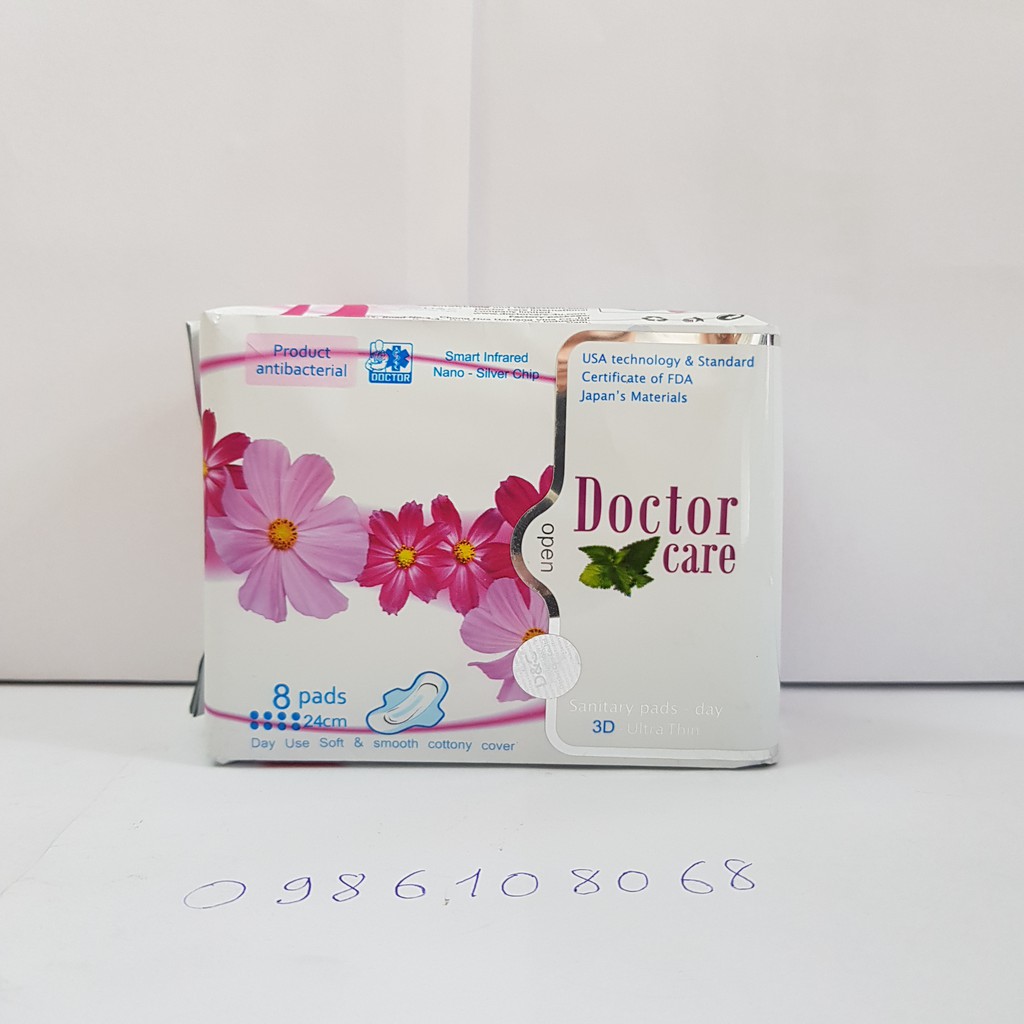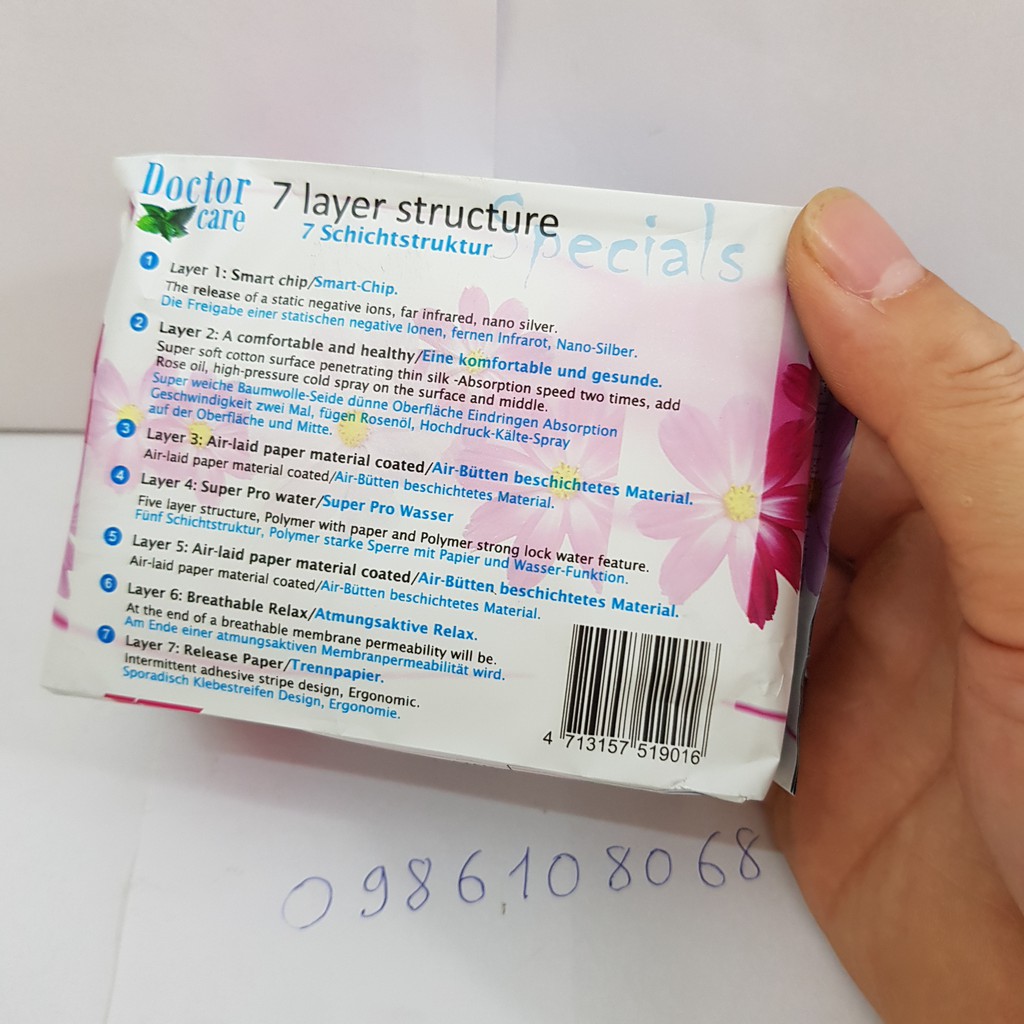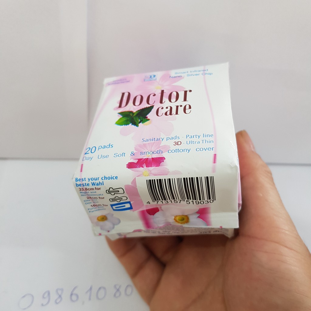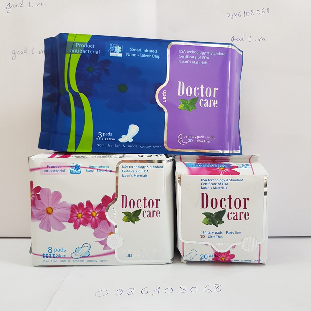 Thương hiệu: Doctor Care Xuất xứ: Đài Loan Quy cách đóng gói: - Ban đêm: 3pcs/ 1 gói ( 33,8cm) - Ban ngày: 8pcs/ 1 gói ( 24cm) - Hàng ngày: 20pcs/ 1 gói ( 16cm) Băng vệ sinh thảo dược Doctor care là sản phẩm của Doctor care International được nhập khẩu và phân phối bởi Doctor Care Việt Nam. Doctor care là băng vệ sinh nhập khẩu 100%, được sản xuất trên dây chuyền công nghệ đạt tiêu chuyển FDA Hoa Kỳ (US FDA), FDA Đài Loan (Taiwan FDA) tại Đài Loan (Taiwan). Nguyên liệu được nhập khẩu từ Nhật bản (Japan), với cấu tạo bề mặt bằng cotton không dệt và giấy polymer công nghệ cao siêu thấm, cấu trúc 3D – 7 lớp độc lập, siêu nhẹ, siêu thấm hút và đặc biệt có lớp đáy khí thở tạo sự thoáng khí, sạch sẽ, tự tin khi dùng. Điểm đặc biệt của bvs Doctor care là có chứa các thành phần thảo dược thiên nhiên như: Tinh chất bạc hà, tinh chất lô hội, tinh chất cây diếp cá, long não hương và các I-on âm vừa mang lại cảm giác the mát thích thú, tự tin, sảng khoái vừa hỗ trợ bảo vệ sức khỏe trong kháng khuẩn, phòng ngừa bệnh phụ khoa. Bvs Doctor Care đã được chứng nhận tại Việt Nam như: Chứng nhận chất lượng của Trung Tâm Kỹ Thuật Đo Lường Chất Lượng I – Tổng Cục Tiêu Chuẩn Đo Lường Chất Lượng, Viện Thực Phẩm Chức Năng – Trung Tâm Kiểm Nghiệm Và Hợp Chuẩn và các chứng nhận Quốc tế như: FDA, GMP, SGS, IA