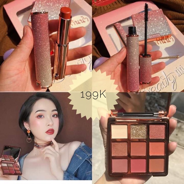 Sản phẩm gồm 1 bảng mắt tone đậm đất 1 son cam đất và 1 mascara siêu sinh bên ngoài đong gói cẩn thận. makeup chỉ trong vài phút với combo cho các bạn nữ xinh rạng rỡ trong ngày hà 😘😘😘😘