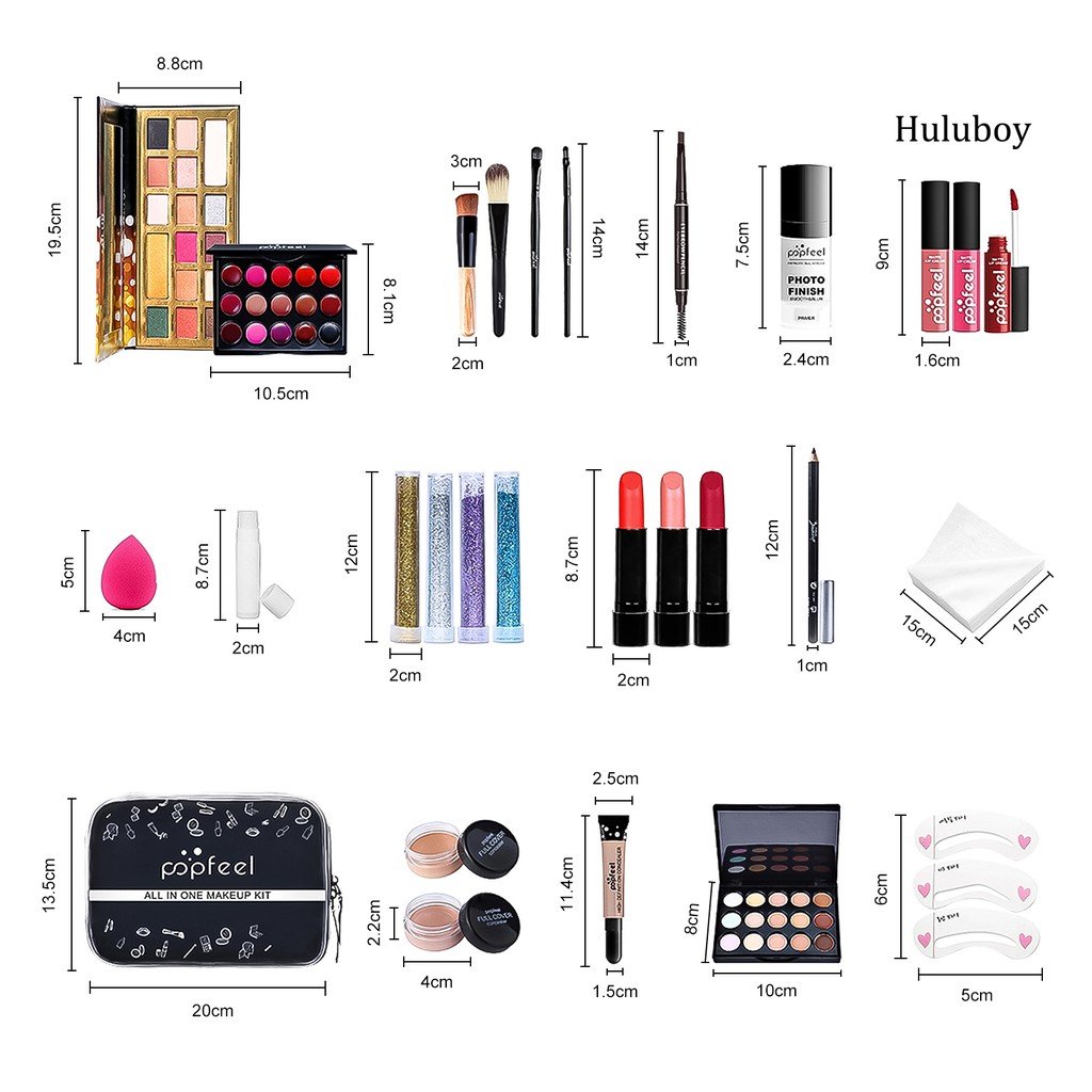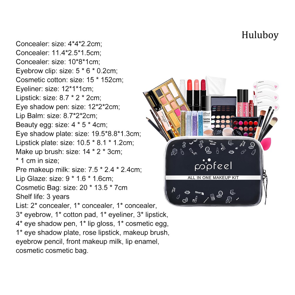 Description: Our set of cosmetics is stylish and practical, and it is very suitable as a gift for friends, family and colleagues. It is very simple for beginners or students to make a makeup that satisfies you, because the makeup set is complete and easy to use. Made of high quality synthetic material, the cosmetic is durable and safe to your skin. The length of this makeup set is 20cm, the width of this product is 13.5cm, the height of this product is 7cm. This makeup set is suitable for different occasions, such as daily makeup, party, makeup studio, etc. Item Name: Makeup Sets Material:Synthetic Net Capacity: Concealer (Boxed): 10ml, Concealer Liquid: 15ml, Concealer Palette: 15g, Eyeliner: 1g, Lipstick: 3.2ml, Eye Shadow Pen: 5ml, Lip Gloss: 3.2ml, Eyeshadow Palette: 50g, Lipstick Tray: 0.5gx5, Eyebrow Pencil: 3g, Primer: 15ml, Lip Glaze: 6g Shelf Life: 3 Years Size Details: Product Overall: 20cm x 13.5cm x 7cm/7.87'' x 5.31'' x 2.76'' (Approx.) Concealer (Boxed): 4cm x 4cm x 2.2cm/1.57'' x 1.57'' x 0.87'' (Approx.) Concealer Liquid: 11.4cm x 2.5cm x 1.5cm/4.49'' x 0.98'' x 0.59'' (Approx.) Concealer Plate: 10cm x 8cm x 1cm/3.94'' x 3.15'' x 0.39'' (Approx.) Thrush Card: 5cm x 6cm x 0.2cm/1.97'' x 2.36'' x 0.08'' (Approx.) Cotton Pad: 15cm x 15cm x 2cm/5.91'' x 5.91'' x 0.79'' (Approx.) Eyeliner: 12cm x 1cm x 1cm/4.72'' x 0.39'' x 0.39'' (Approx.) Lipstick: 8.7cm x 2cm x 2cm/3.43'' x 0.79'' x 0.79'' (Approx.) Eye Shadow Pen: 12cm x 2cm x 2cm/4.72'' x 0.79'' x 0.79'' (Approx.) Lip Gloss: 8.7cm x 2cm x 2cm/3.43'' x 0.79'' x 0.79'' (Approx.) Beauty Egg: 4cm x 5cm x 4cm/1.57'' x 1.97'' x 1.57'' (Approx.) Eyeshadow Palette: 19.5cm x 8.8cm x 1.3cm/7.68'' x 3.46'' x 0.51'' (Approx.) Lipstick Tray: 10.5cm x 8.1cm x 1.2cm/4.13'' x 3.19'' x 0.47'' (Approx.) Makeup Brush: 14cm x 2cm x 3cm/5.51'' x 0.79'' x 1.18'' (Approx.) Eyebrow Pencil: 14cm x 1cm x 1cm/5.51'' x 0.39'' x 0.39'' (Approx.) Primer: 7.5cm x 2.4cm x 2.4cm/2.95'' x 0.94'' x 0.94'' (Approx.) Lip Glaze: 9cm x 1.6cm x 1.6cm/3.54'' x 0.63'' x 0.63'' (Approx.) Cosmetic Bag: 20cm x 13.5cm x 7cm/7.87'' x 5.31'' x 2.76'' (Approx.) Notes: Due to the light and screen setting difference, the item's color may be slightly different from the pictures. Please allow slight dimension difference due to different manual measuremen. Package Includes: 1 X Cosmetic Bag 3 X Lip Glaze 1 X Primer 1 X Eyebrow Pencil 4 X Makeup Brush 1 X Lipstick Tray 1 X Eyeshadow Palette 1 X Beauty Egg 1 X Lip Balm 4 X Eyeshadow Pen 3 X Lipstick 1 X Eyeliner 1 X Cotton Pad 3 X Thrush Card 1 X Concealer Palette 1 X Concealer Liquid 2 X Concealer (Boxed)